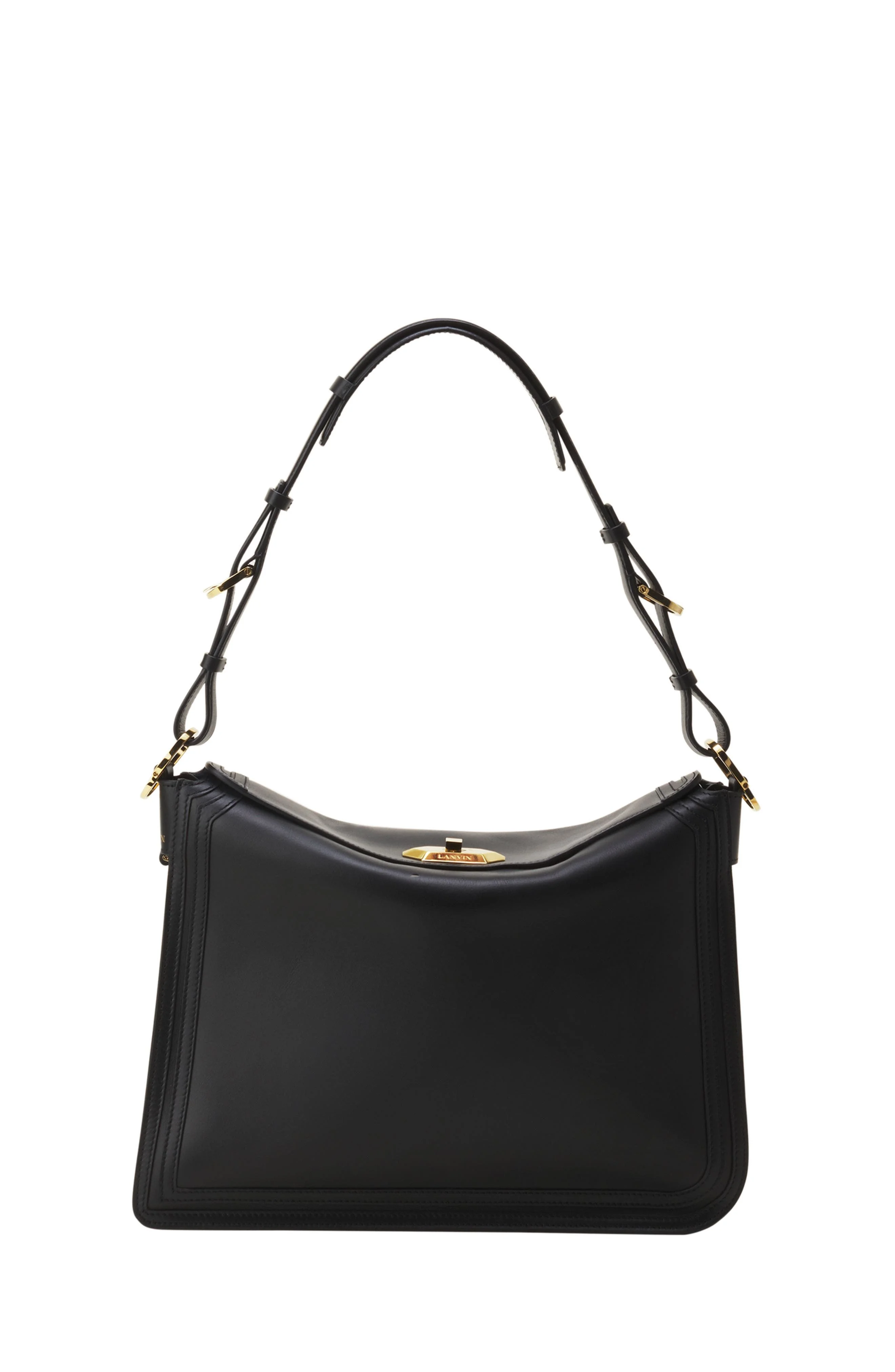 The Compagnon Bag is designed to keep you company when you’re on the go and protect your precious moments. Its three compartments provide optimum organization and make it easy to quickly find your most precious items. The envelope-inspired design is a true symbol of confidence. The asymmetrical design is enhanced by topstitched bands that highlight the initials J and L, which stand for Jeanne Lanvin, adding a touch of understated, timeless elegance. The inside of the bag features a Lanvin blue smooth leather lining with a contrasting leather slit, delicately embossed with the Lanvin logo and completed with an elegant gold mirror with refined lines. Compagnon Asymmetrical Leather Bag Clasp Inspired By The Lanvin Hexagonal Label Interior Mirror J- And L-Shaped Topstitched Side Bands Leather Lining Made In Italy