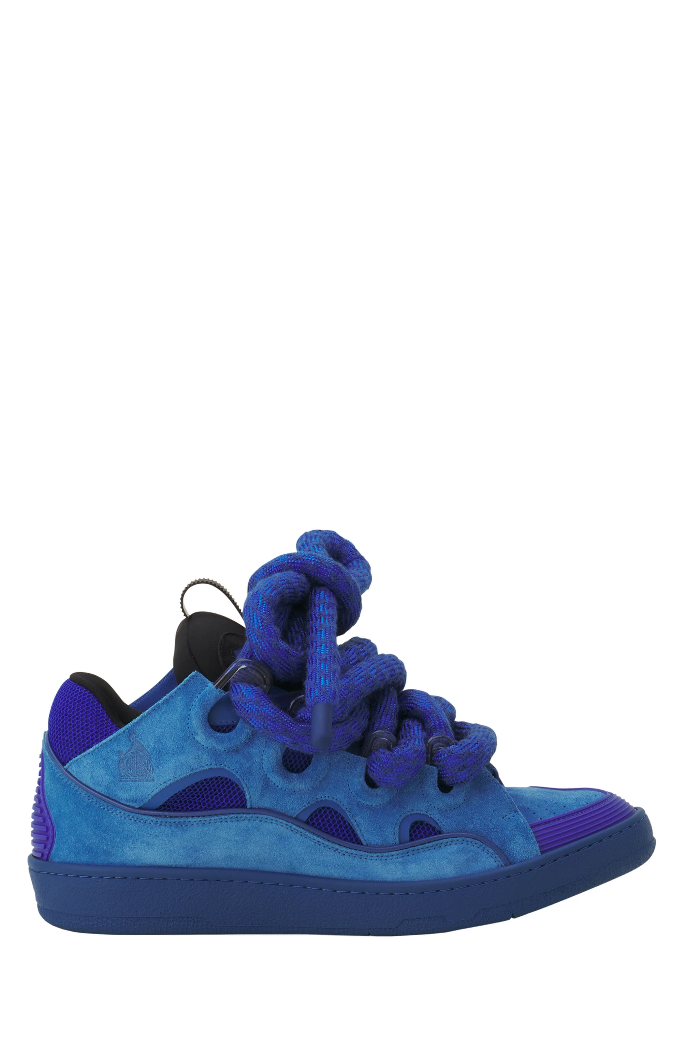 The '90s-inspired Curb sneaker features an assertive design and an exaggerated silhouette. Crafted from nappa calfskin, suede, and mesh, this intricately constructed style is characterized by the ultimate in comfort thanks to its round shape, padded tongue, and metallic eyelets. This collection features extra-large tubular laces, the Snake laces, which take their inspiration from the Serpents of Jeanne Lanvin's 20s Winter collection creations. Curb Leather Sneakers With Snake Laces Double, Extra-Wide, Two-Tone Tubular Laces With Plastic Tips Padded Tongue With The Lanvin Label Mother And Daughter Logo Embossed On The Side Made In Portugal