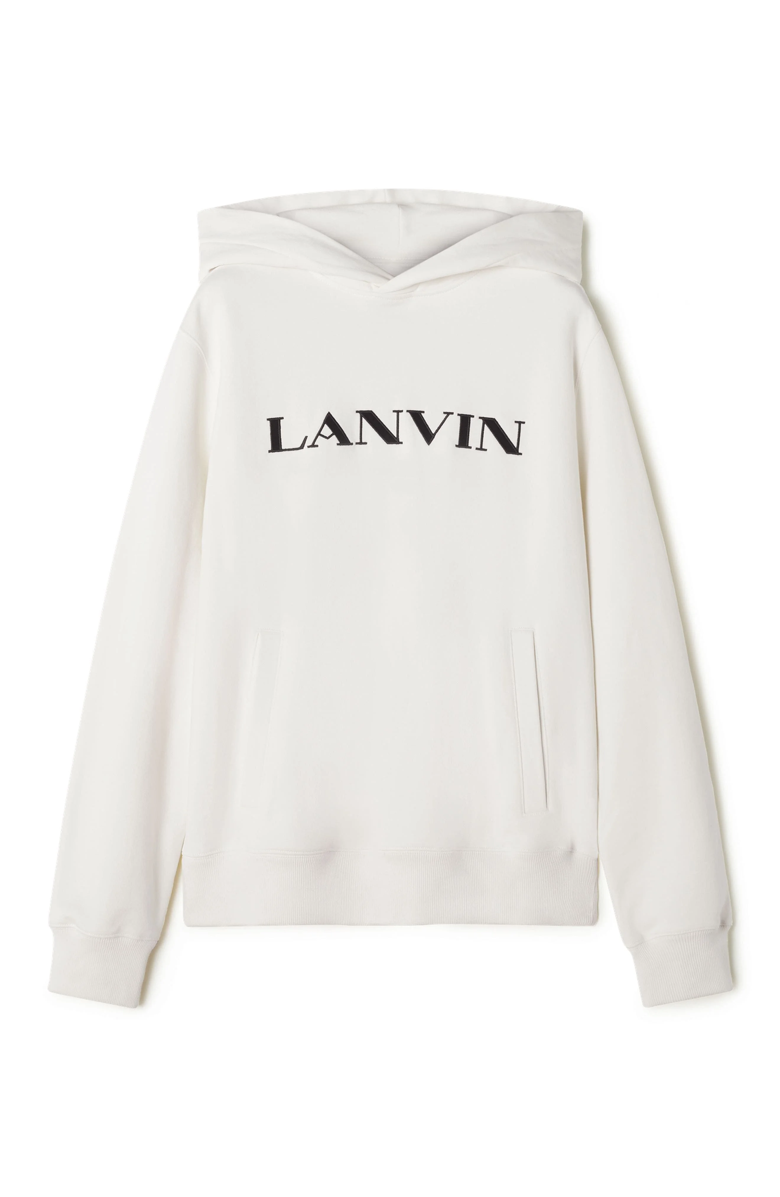 The Lanvin logo on the front of this hoodie adds a touch of timeless elegance to this men's wardrobe essential. The comfortable fit and soft fabric make it a stylish piece to pair with a casual outfit. Lanvin Embroidered Cotton Hoodie Straight Fit Drawstring Hood Ribbed Cuffs Side Welt Pockets Lanvin Embroidered Logo In Contrasting Cotton Gabardine Made In Portugal