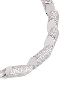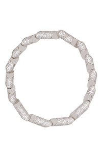 The Haute Sequence jewelry line is a tribute to Marie-Blanche de Polignac, Jeanne Lanvin's daughter, and also a musician. The sophisticated, minimalist shapes of these jewels are inspired by the geometric symbols used in musical scores. This necklace is traditionally handcrafted. It is composed of several beveled cylinders, which are linked by a fine metal chain thus creating an elegant movement. The cylinders are paved with 5,500 cubic zirconia, a synthetic stone that imitates the brilliance and appearance of diamonds.| Haute Sequence rhinestone necklace Cylinders paved with cubic zirconia or polished with a mirror effect Handcrafted Made in Italy