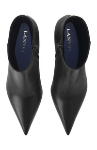 The Midnight Step small-heeled leather ankle boot embodies elegance in its purest form, with simplicity and refinement. Its refined, contemporary design is enhanced by a curved heel, lending stability, lightness and sophistication. Gold hot stamping with the House's signature is delicately applied to the Lanvin blue insole. This precious and elegant creation will make every step a gesture imbued with character. Midnight Step Leather Ankle Boot Gold Metal Label With The Lanvin Logo Lanvin Logo Hot-Stamped In Gold Lanvin Blue Padded Insole 5 Cm Heel Made In Italy