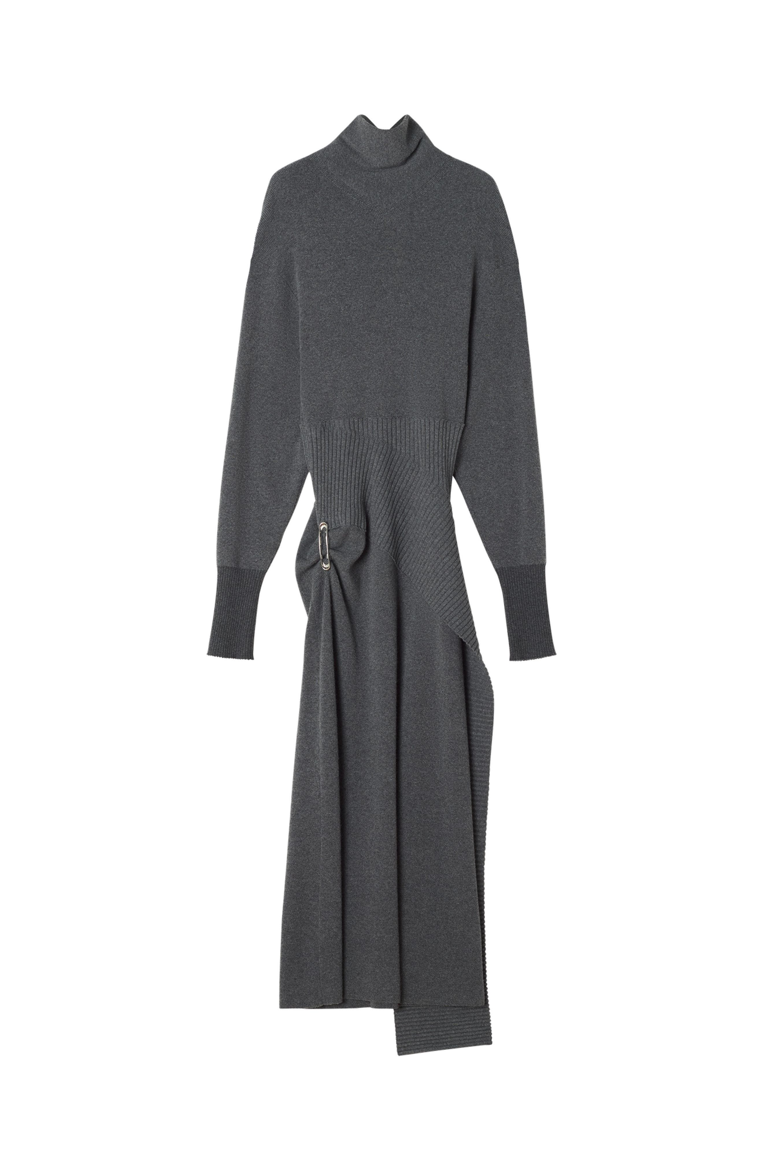 This dress is crafted from a blend of wool and cashmere. The fabric is soft, lightweight, and warm, and features draping reminiscent of some dresses found in the Maison's archives. The brooch adorning this piece adds an elegant, modern touch to a casual outfit. Wool And Cashmere Midi Dress Tailored Fit At The Waist High Collar Dropped Shoulders Ribbed Cuffs Draped Waist Lanvin Signature Brooch