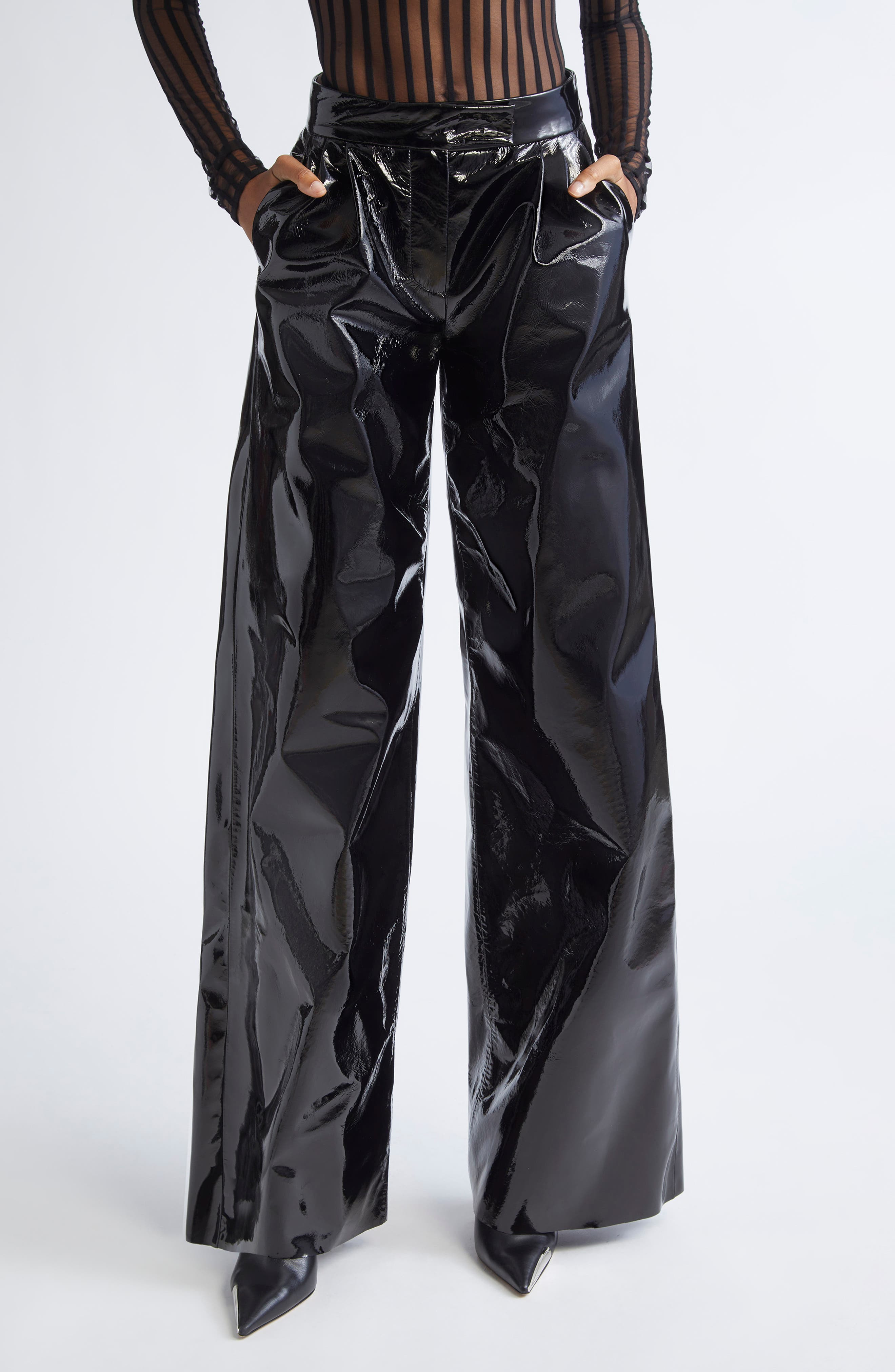 These lookbook-featured wide-leg trousers redefine power dressing in crinkled patent leather for rebellious glamour reminiscent of the '80s. Zip fly with hook-and-bar closure Front slant pockets; back welt pockets Leather Professional leather clean Made in the USA Designer Clothing