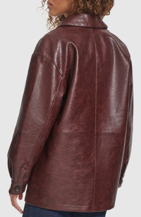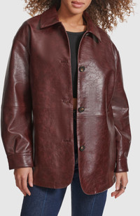 Mottled buttons trace this oversized jacket cut from sleek faux leather in a rich butterscotch hue. 29 1/2" length (size Medium) Spread collar Lined 100% polyurethane Machine wash, tumble dry Imported
