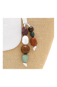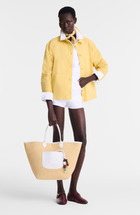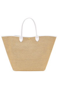 Finely woven canvas and richly textured leather bring textural interplay to a versatile bag fitted with easy shoulder straps and shaped in an iconic silhouette that conveniently folds flat for storage. 11" x 13 3/4" x 7 3/4" 1.91 lb Snap closure Shoulder straps Exterior slip pocket Interior zip pocket Flat base for stability Cotton lining Canvas straw with leather trim Imported