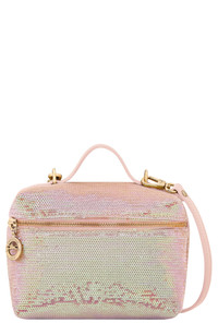 Add a little glitz and glamour to your look with this vanity-style crossbody boasting light-catching holographic sequins and a structured silhouette that's delightfully compact. Top zip closure Top carry handle; removable, adjustable crossbody strap Lined Textile Imported