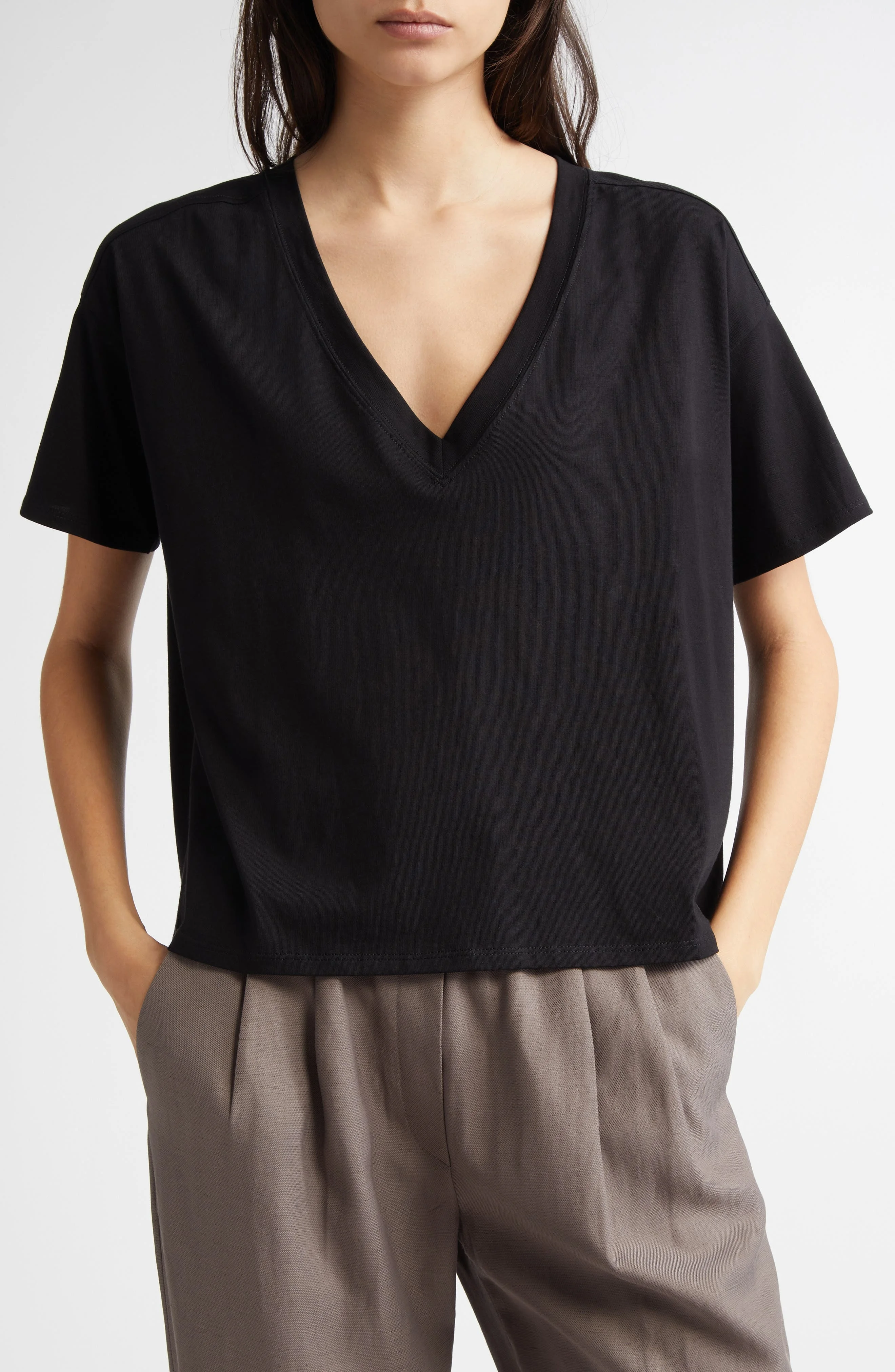 An elevated take on the basic white T-shirt, this version features a boxy, oversized fit with dropped shoulders and a V-neckline. 22" length (size Medium) V-neck Short sleeves 100% pima® cotton Machine wash, dry flat Made in Portugal Women's Designer Clothing This brand has B Corp certification, representing business practices with emphasis on social and environmental performance, accountability and transparency This brand meets Nordstrom Responsible Brands criteria: brand adheres to responsible social and environmental practices