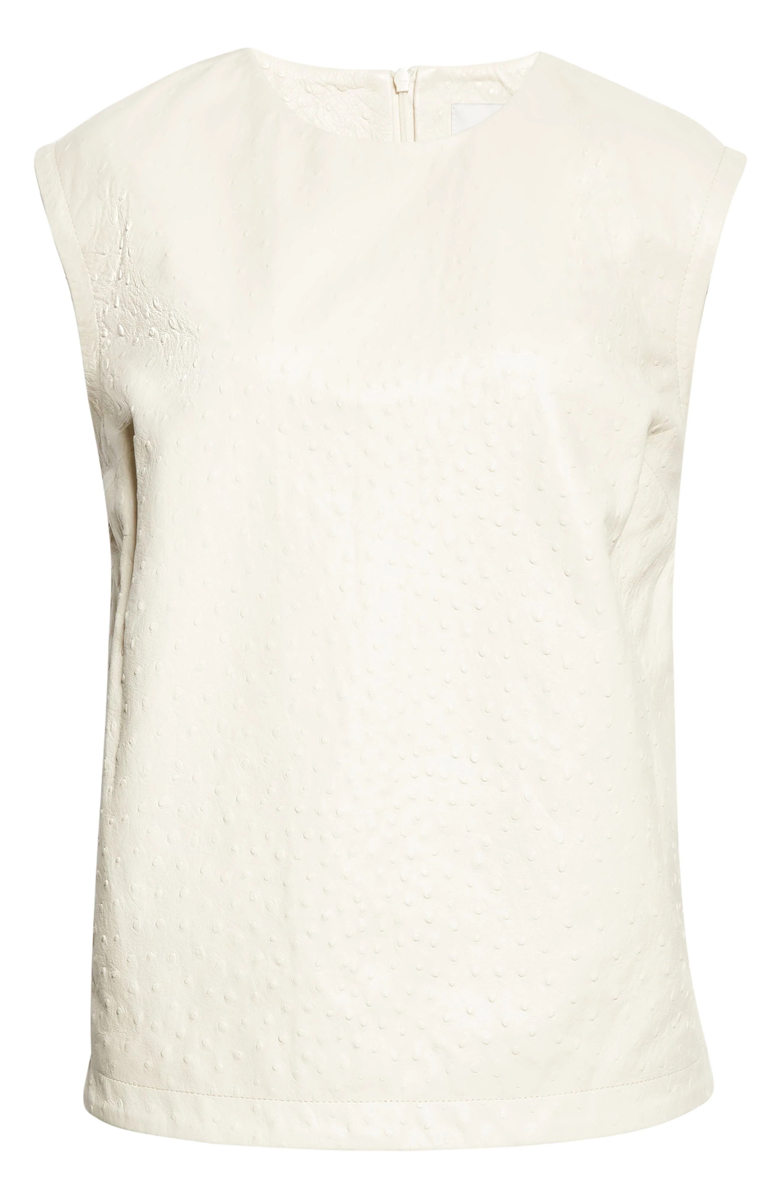 Supple lambskin leather is embossed to resemble ostrich leather, giving this boxy sleeveless top an enviably unique look. Hidden back-zip closure Jewel neck Sleeveless Leather Professional leather clean Made in Turkey Designer Clothing