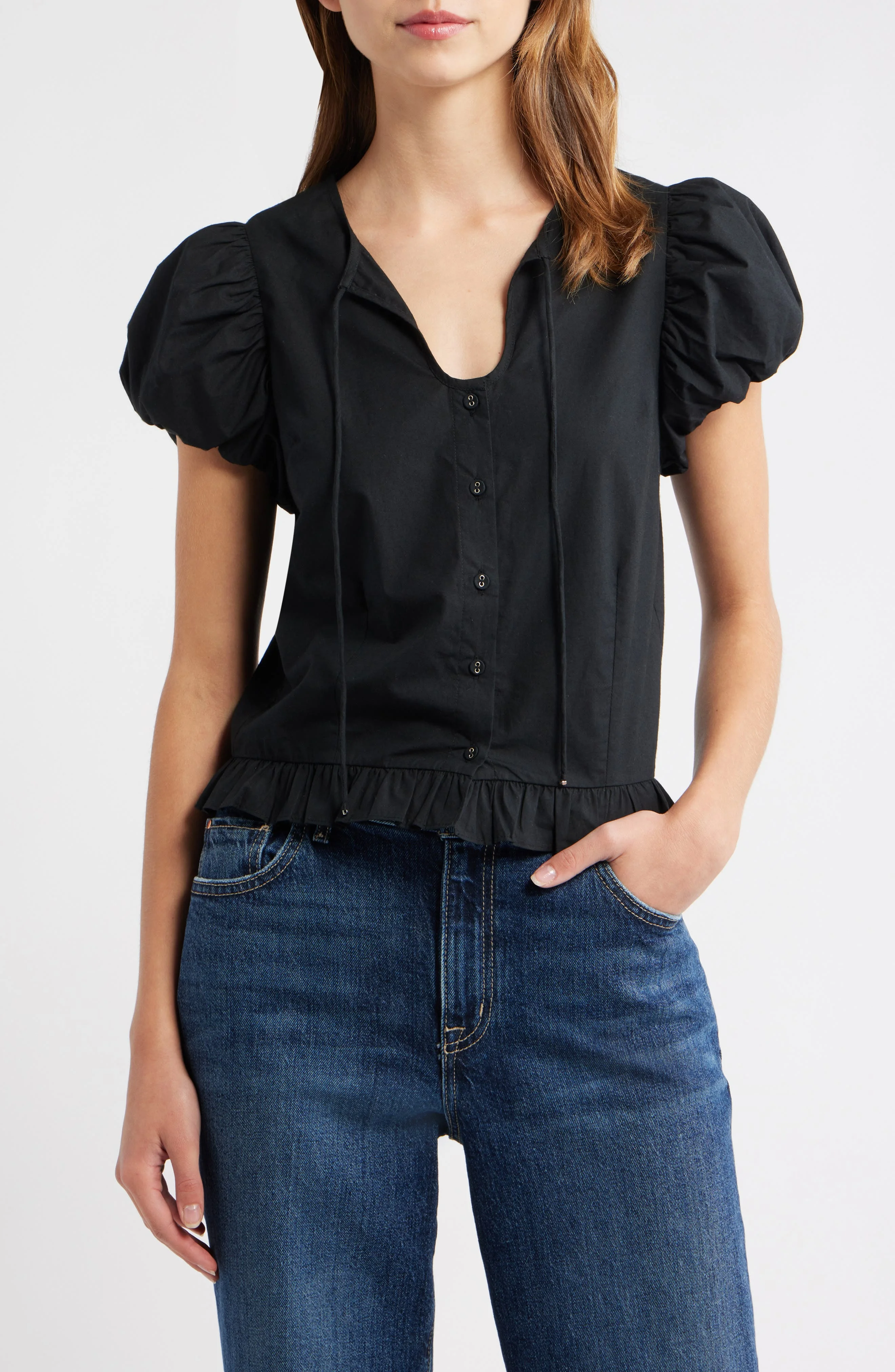 LOVE THE LABEL Iridessa Keyhole Puff Sleeve Cotton Button-Up Top in Black at Nordstrom