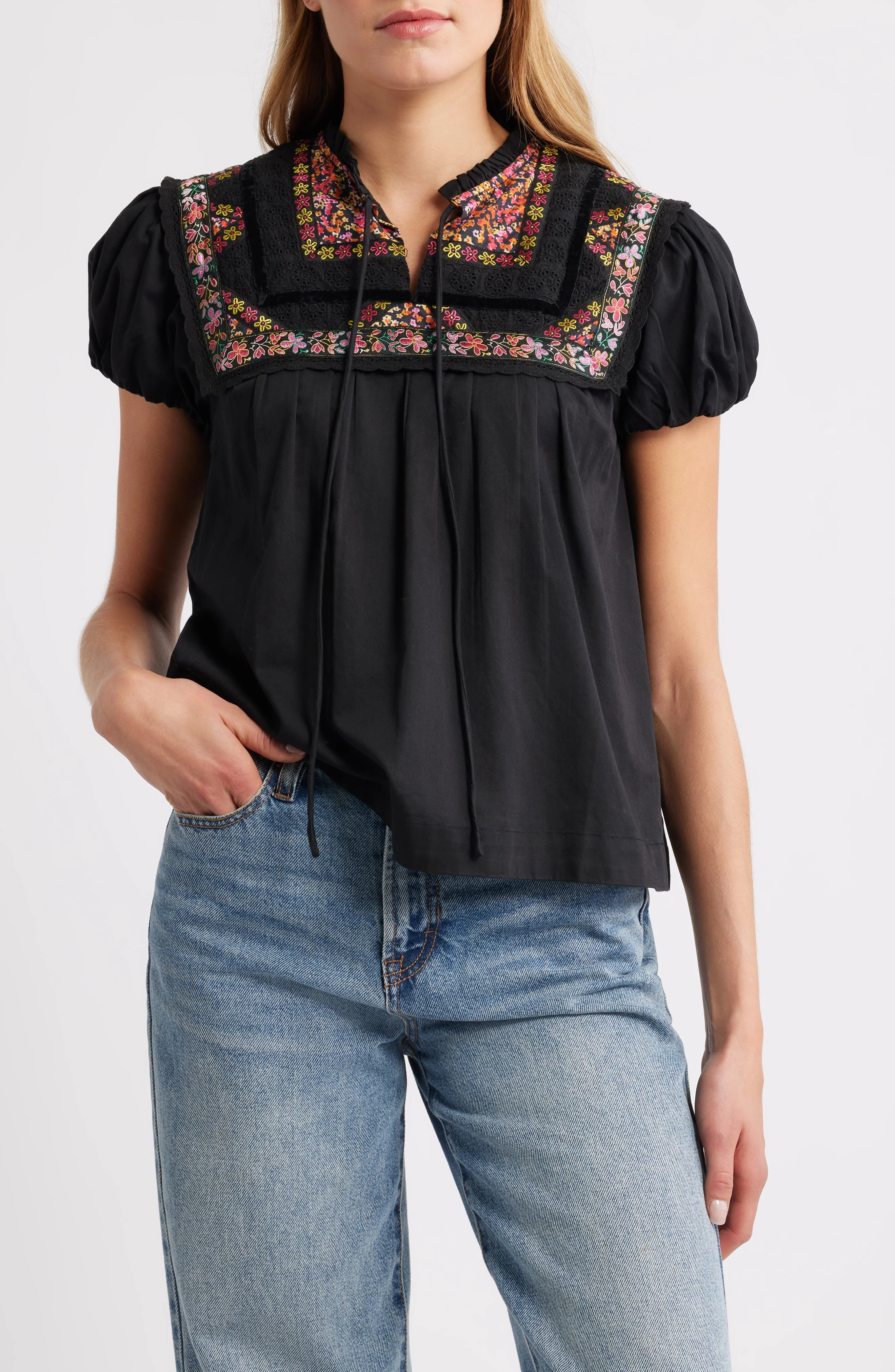 Darling puff sleeves sweeten the silhouette of this flowy top cut from breezy cotton and accented with an enchanting embroidered yoke. Ties at neck Short sleeves 100% cotton Machine wash, line dry Imported