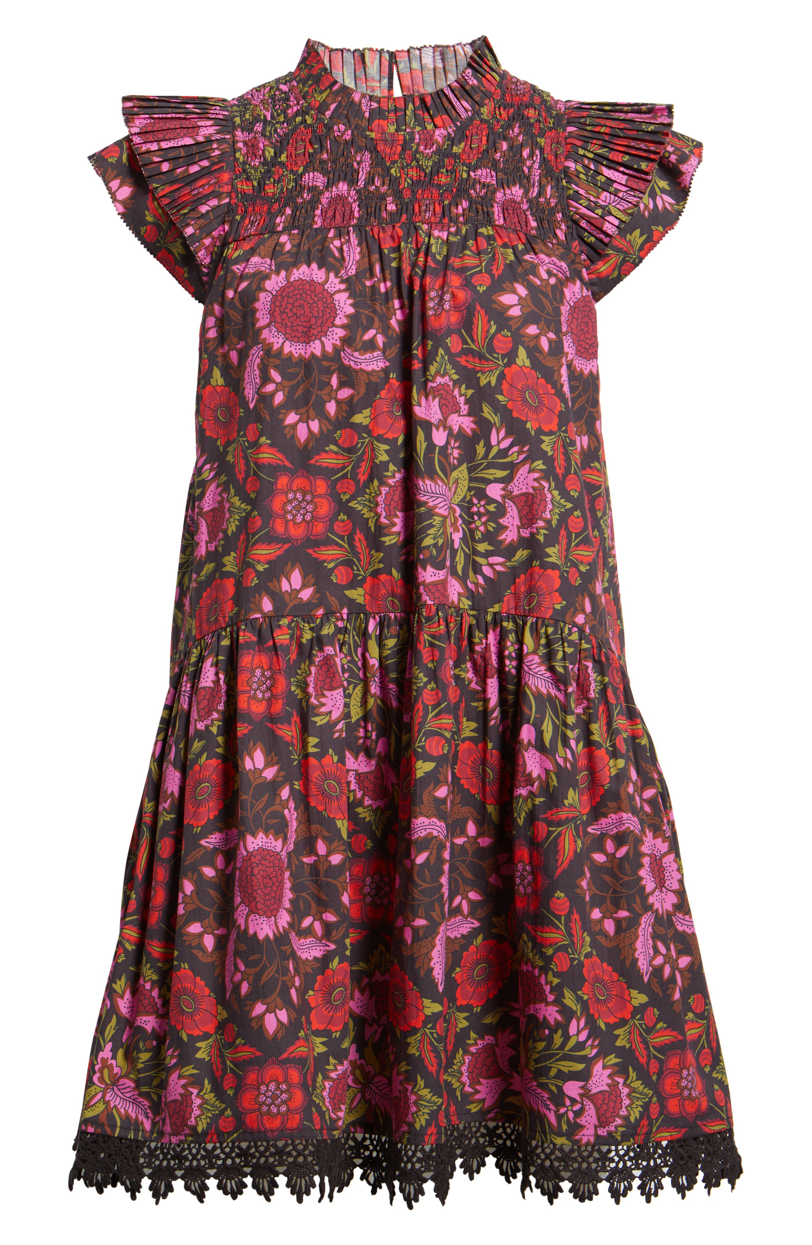 Boldly colored flowers steal the scene on a playful drop-waist minidress designed with tiered cap sleeves and scalloped lace at the hem. Back keyhole with button-and-loop closure Ruffle collar Cap sleeves 100% cotton Machine wash, line dry Imported