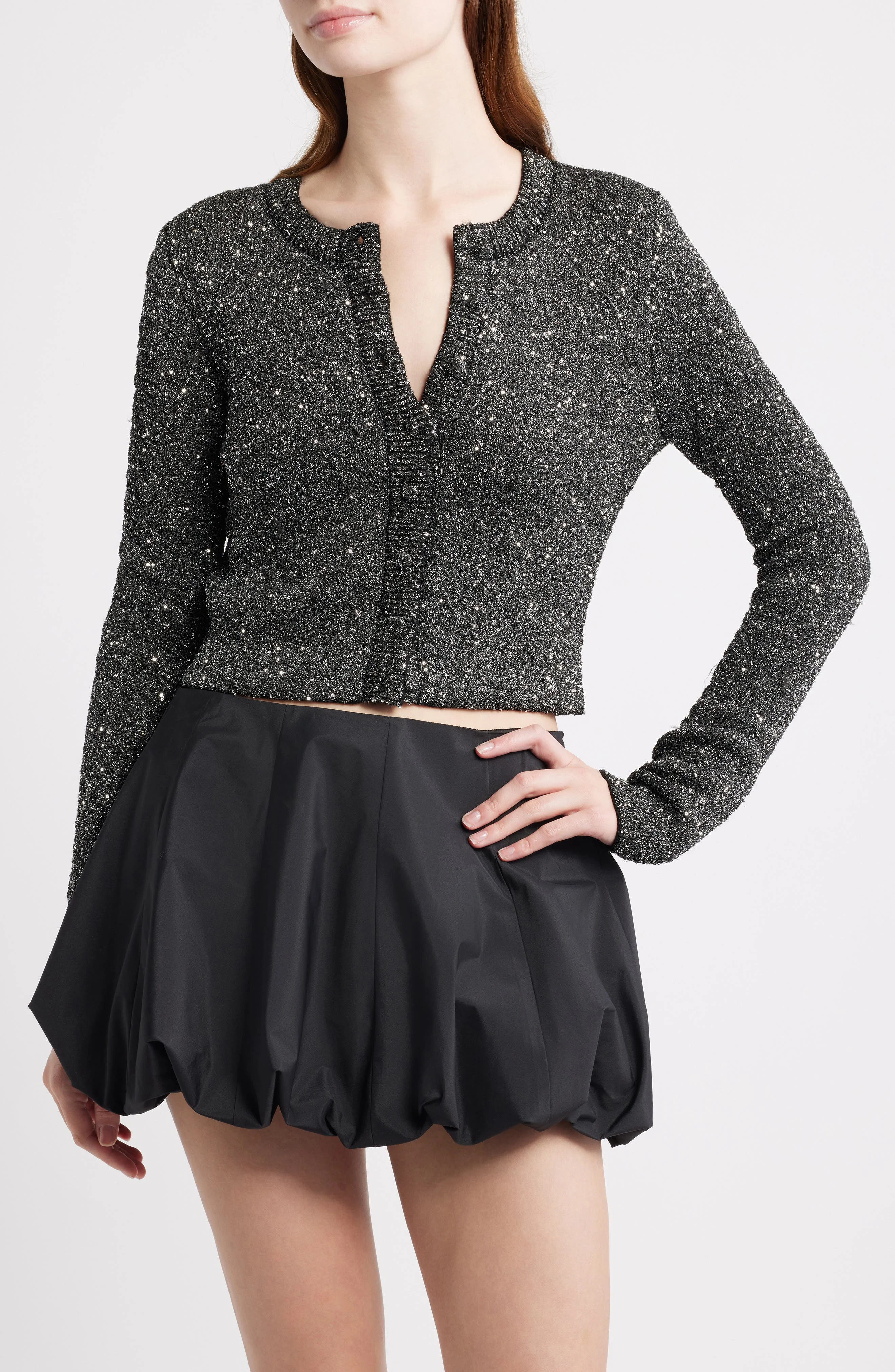Lustrous embellishments elevate this cropped cardigan that transitions perfectly from day to night. 22" length Front button closure Crewneck Long sleeves 91% recycled polyester, 9% metallic fibers with 82% viscose, 18% polyester contrast Dry clean Imported