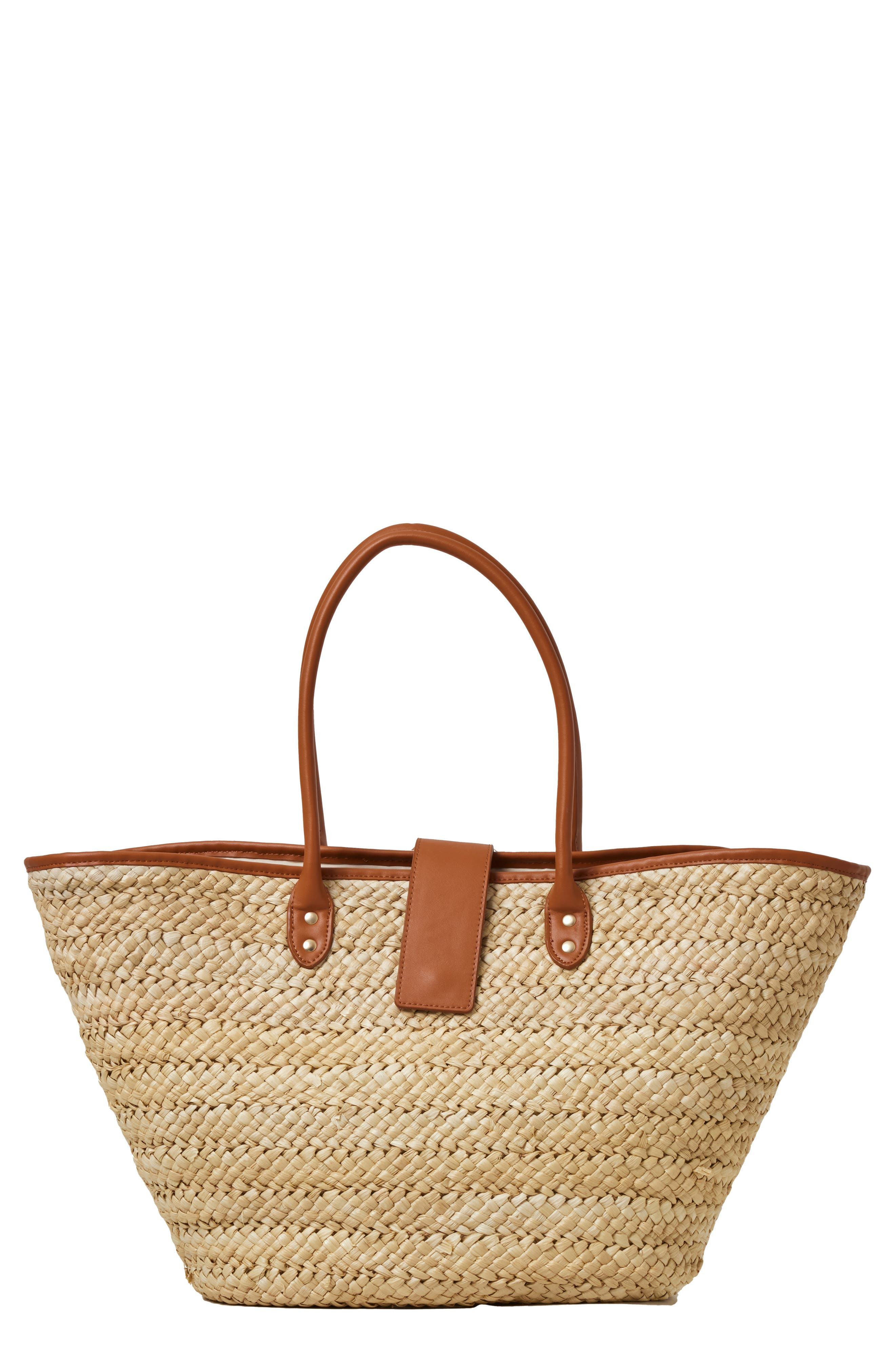 Complete your beach-day look with this basket-style tote woven from natural cornhusks in a silhouette large enough to fit all your out-in-the-sun essentials. Magnetic-tab closure Shoulder straps Structured silhouette with flat base for stability Cornhusk with synthetic trim Imported
