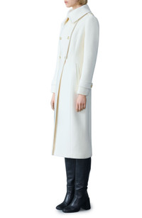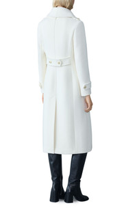 A broad, draping collar, epaulets and belted cuffs bring a commanding yet elegant presence to a double-breasted military jacket cut with an elongated maxi silhouette. 47 1/2" length (size Medium). Front button closure. Long sleeves with belted cuffs. Front welt pockets. Back belt. Center vent. Fully lined. 100% wool with leather trim. Professional leather clean. By Mackage; imported. Coats.