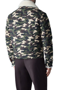 Plush, warm shearling layers over the collar and spills out from the cuffs of a trucker jacket made of durable cotton with a camo pattern that can't hide the cozy warmth and comfort. A quilted interior and lightweight insulation help keep the cold at bay, while pockets inside and out protect hands and stow essentials when you're out and about. 25" length Front button closure Spread collar with removable genuine-shearling layer Adjustable button cuffs Chest button-flap patch pockets; front welt pockets; interior zip-welt pocket Adjustable button side tabs Quilted lining, with 100% synthetic fill 100% cotton, with genuine-shearling (India) trim Professional leather clean Imported