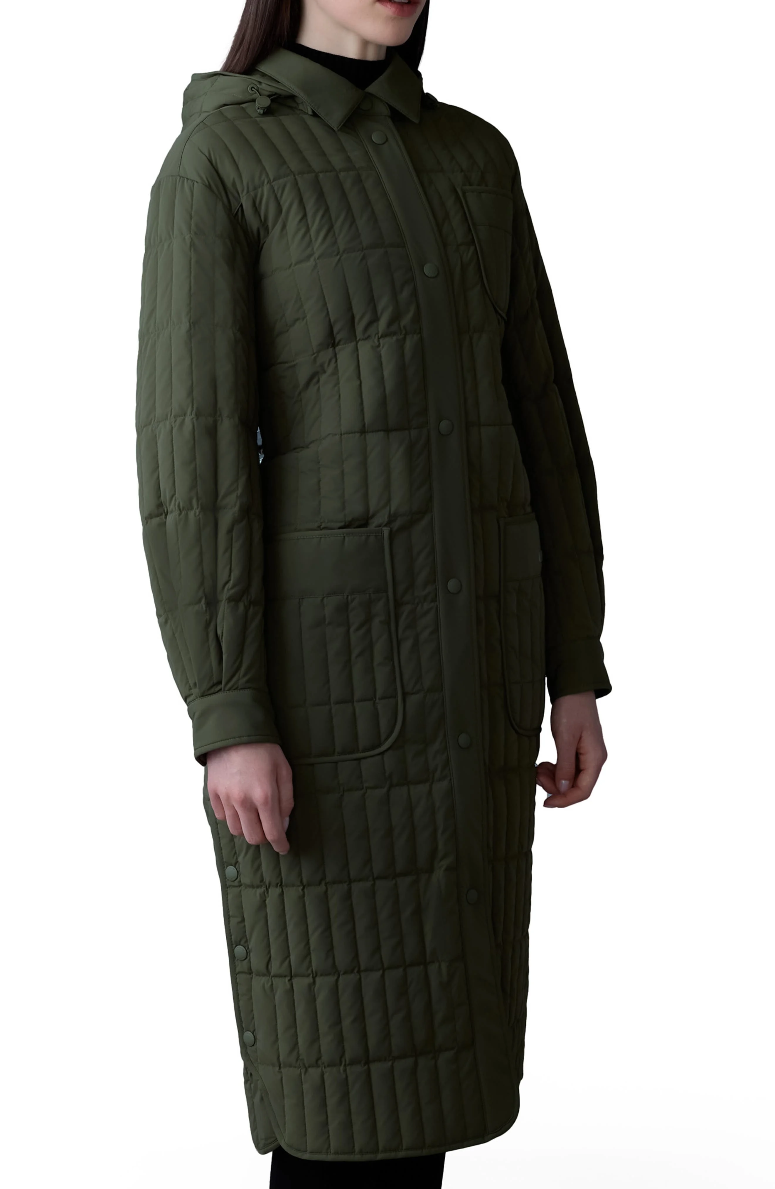 A pillowy removable hood amplifies the cozy comfort of this quilted jacket styled in a longline silhouette for ideal cold-protection coverage. 44 1/2" length Front snap closure Removable drawcord hood Chest patch pocket; front patch pockets Windproof Water resistant Side vents Inner drawstring waist Lined, with 90% down, 10% feather fill (China) 82% recycled nylon, 18% elastane Machine wash, line dry Made in China