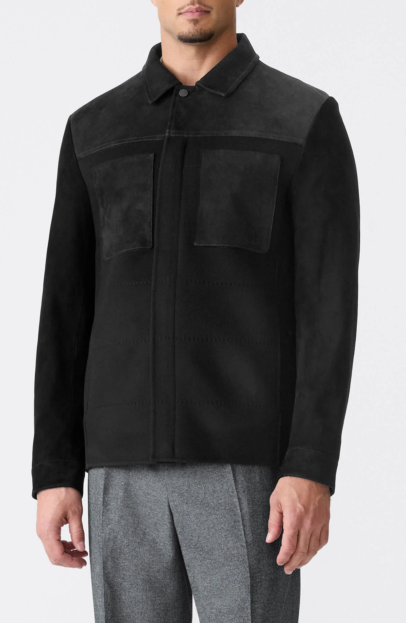 Tailored close to the body, this slim-fit shirt jacket is handmade from double-face wool for a clean, substantial feel with a smooth drape. Goatskin suede trim sharpens the mixed-media contrast, while a center-front zip reinforced with PU tape adds a sleek, durable finish. Refined pickstitching seals the deal with detail you notice up close. 27 1/2" length Front zip closure with snap storm placket Spread collar Adjustable snap cuffs Chest patch pockets; side-seam pockets Temperature rated to 41°F/5°C Partially lined 100% wool with leather contrast Professional leather clean Imported
