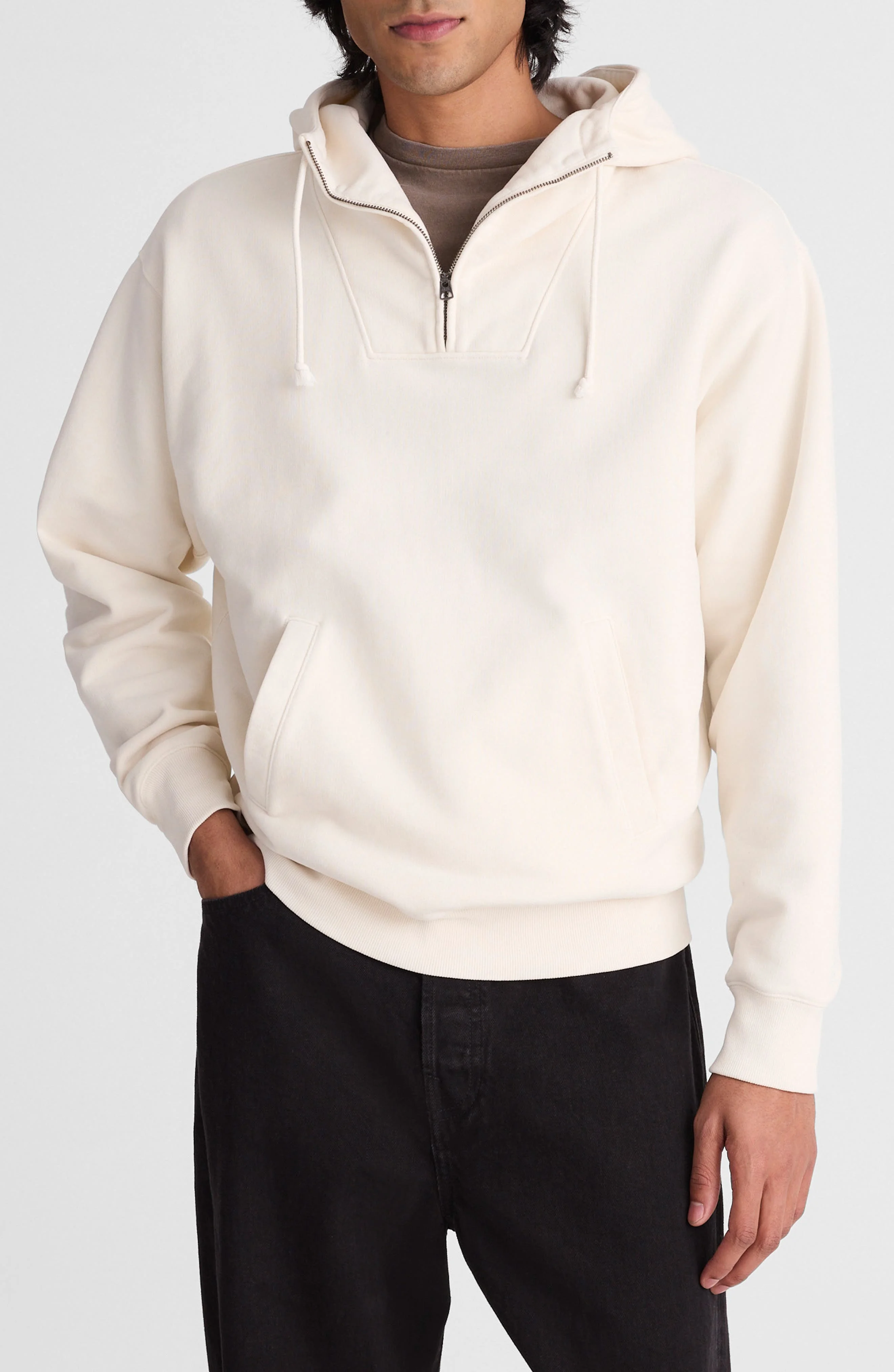 A subtle update to Madewell's best-selling sweatshirt, this version features the same garment-dyed French terry fabric, now cross-cut to prevent vertical shrinkage. An anorak-style neck, dropped shoulders and side-seam expansion gussets finish the piece. 27" length Half-zip closure Drawstring hood Long sleeves Kangaroo pocket 85% cotton, 15% polyester Machine wash, tumble dry Imported