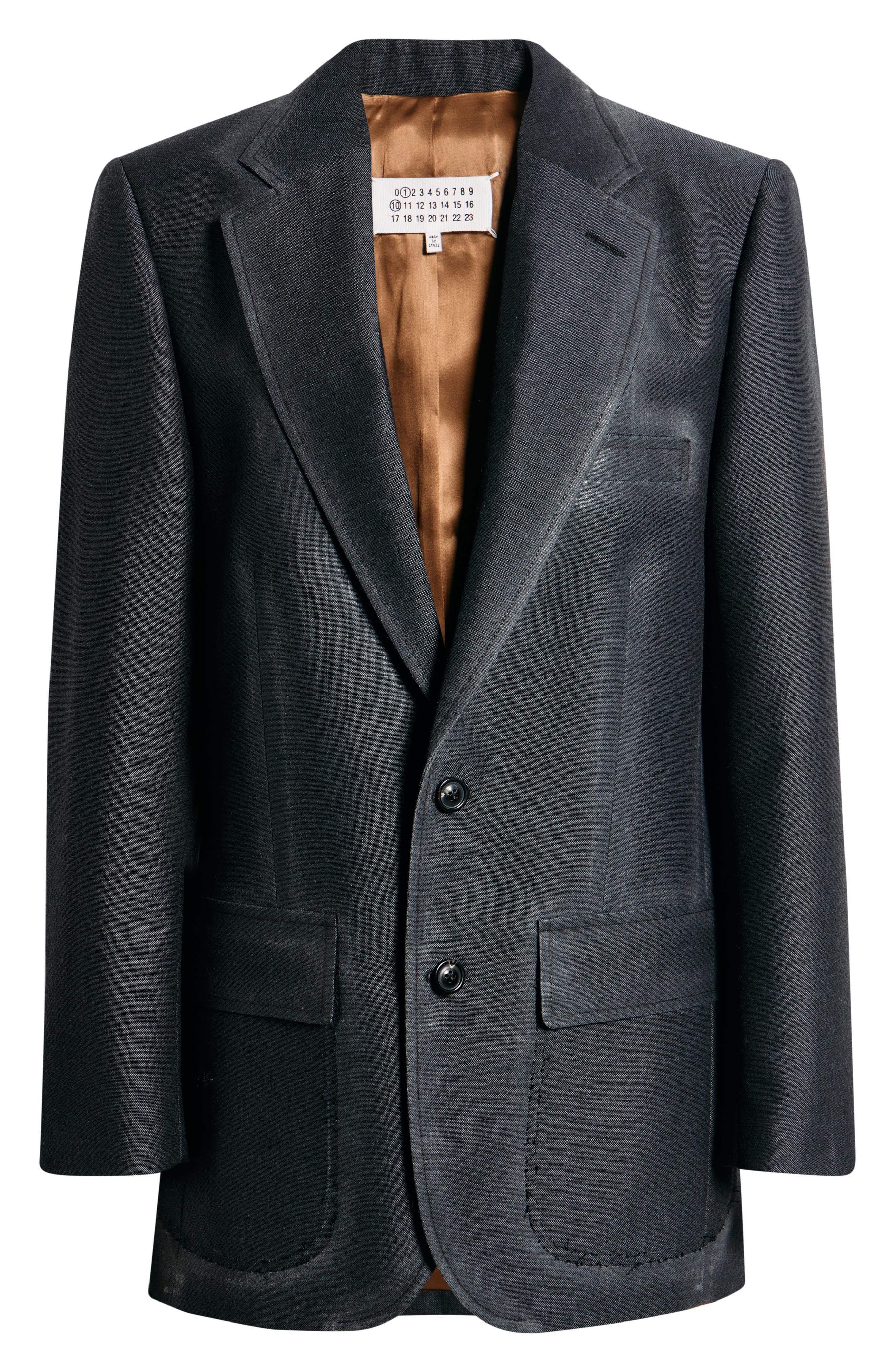 Margiela's subversive tailoring shows through in this oversized wool-mohair blazer transformed through the maison's 'pressed to death' concept—a treatment of heat, pressure and hand-painted details. Haphazard pocket stitching hints at the garment's construction while the brand's discreet yet distinct four-stitch moniker adds an in-the-know touch at nape. Front button closure Notched lapels Chest welt pocket; front flap pockets Three-button cuffs Back vent Satin lining 70% wool, 30% mohair Dry clean Made in Italy Designer Clothing