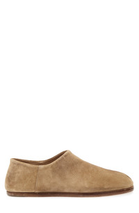 Merging a fifteenth-century Japanese tabi sock and a classic babouche slipper, this split-toe suede flat is both avant-garde and traditional. Signature touches include a white basting stitch at the heel counter and numerical debossing along the sole. Leather upper, lining and sole Made in Italy Designer Shoes