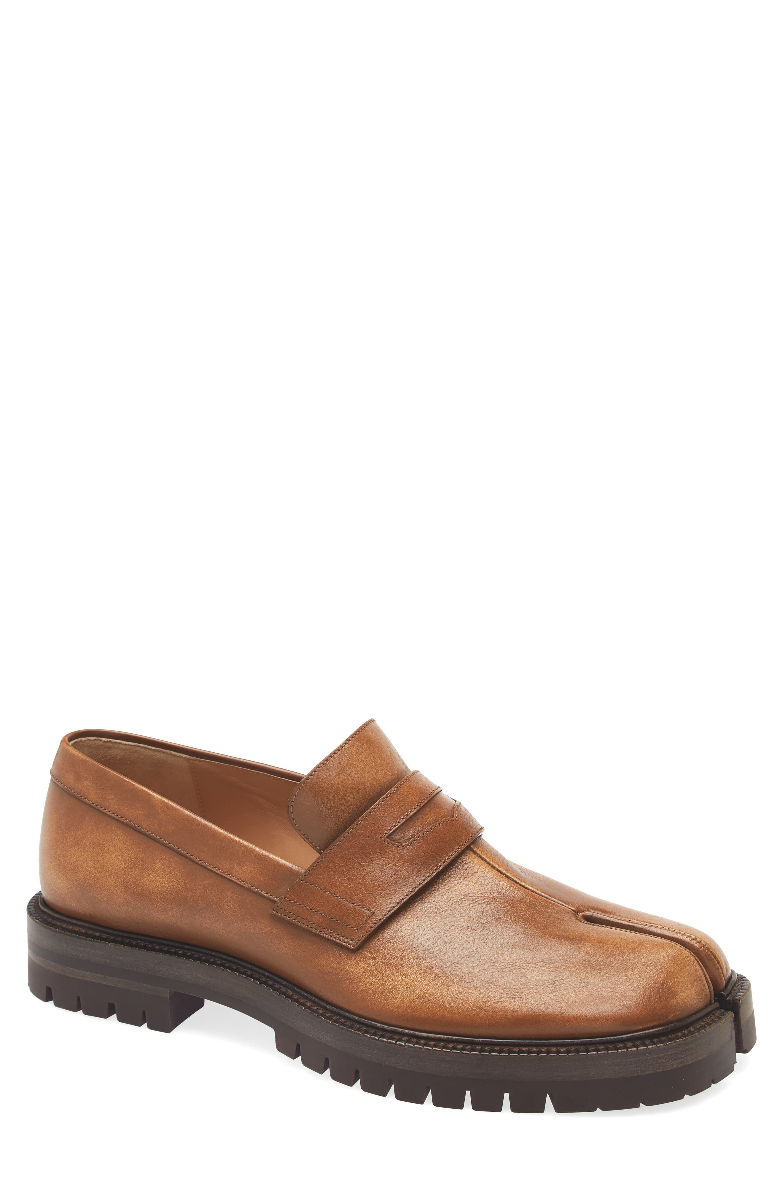 A signature style inspired by the Japanese tabi sock merges with a platform penny loafer to create a hybrid shoe that pushes the boundaries of both classics. Leather upper and lining/rubber sole Made in Italy Designer Shoes