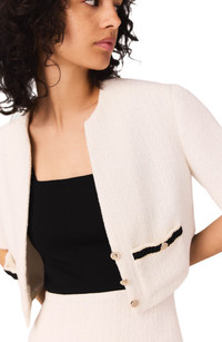 Maje reinvents preppy style with modern, structured pieces, ideal for transitioning between seasons. A feminine and versatile wardrobe distinguished by its interplay of textures and refined details.This 2-in-1 dress combines a ribbed knit top and a tweed skirt, and a jacket creating an elegant and contemporary silhouette offering multiple possibilities. Short with a contrasting collar and short sleeves, it adds a touch of boldness and can also be worn alone, with a t-shirt and jeans. Perfect for a preppy look, pair it with a fringed suede bag and loafers with socks for a chic and casual style. 2-in-1 tweed effect dress Ribbed knit tank top and tweed skirt Short jacket with contrasting collar and short sleeves 2 pockets The model is 5'9 tall and wears a size 4
