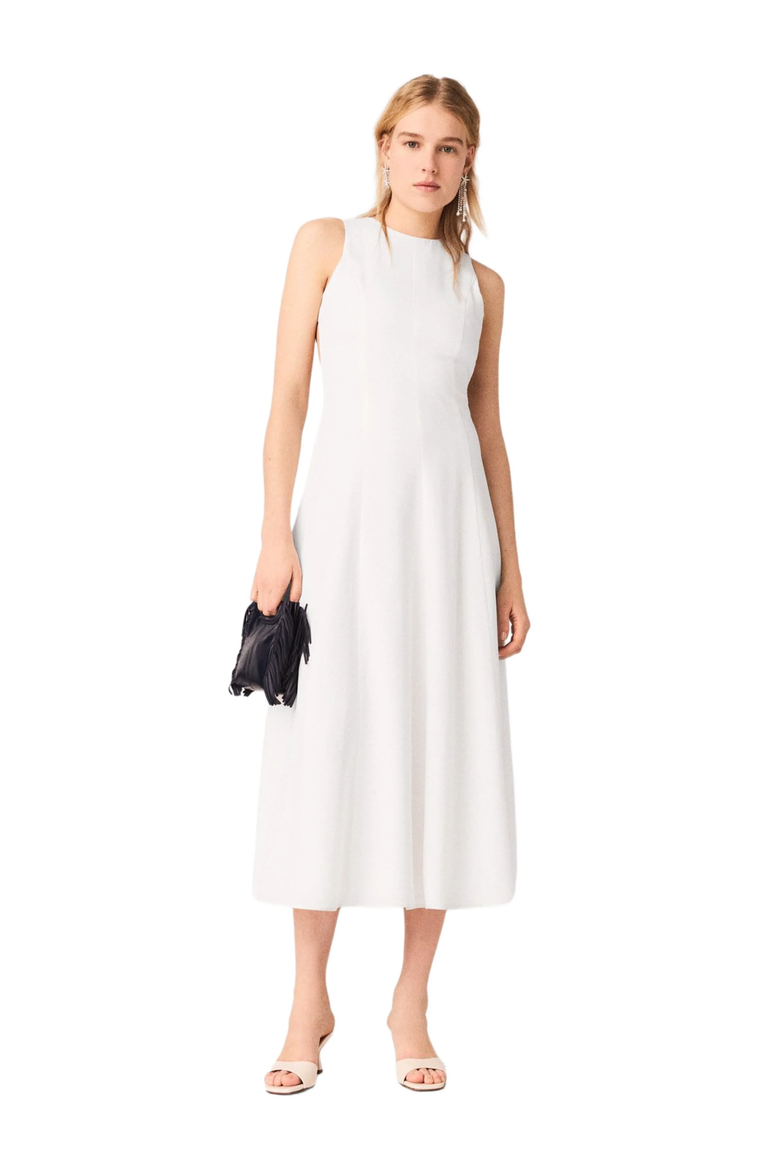 The Maje woman embodies a resolutely modern look, where the purity of white and sculptural lines celebrate effortless elegance and a new romanticism.This midi dress features a fitted bust and a flared skirt, enhanced by a deep open back that makes all the difference. The high crew neck contrasts with the flowing fit, while the princess seams and clean finishes create a refined and graphic silhouette.Add a mini M bag, slim heeled mules and dangling earrings for a sophisticated evening look. Flared midi dress Deep open back High crew neck Invisible back zip Structuring princess seams The model is 5'8 tall and wears a size 36