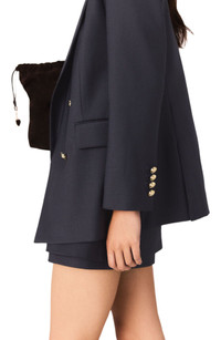 Imagined as a reimagined tailoring, the collection puts a twist on classic suits with striking details.This structured jacket adds a lot of style to the silhouette and features a double-breasted design with officer buttons, inspired by the naval wardrobe.Wear it as a complete look with matching shorts, a colourful knit polo, and leather ankle boots. Suit jacket with officer buttons Structured cut with shoulder pads Double-breasted fastening The model is 5'8 tall and wears a size 4