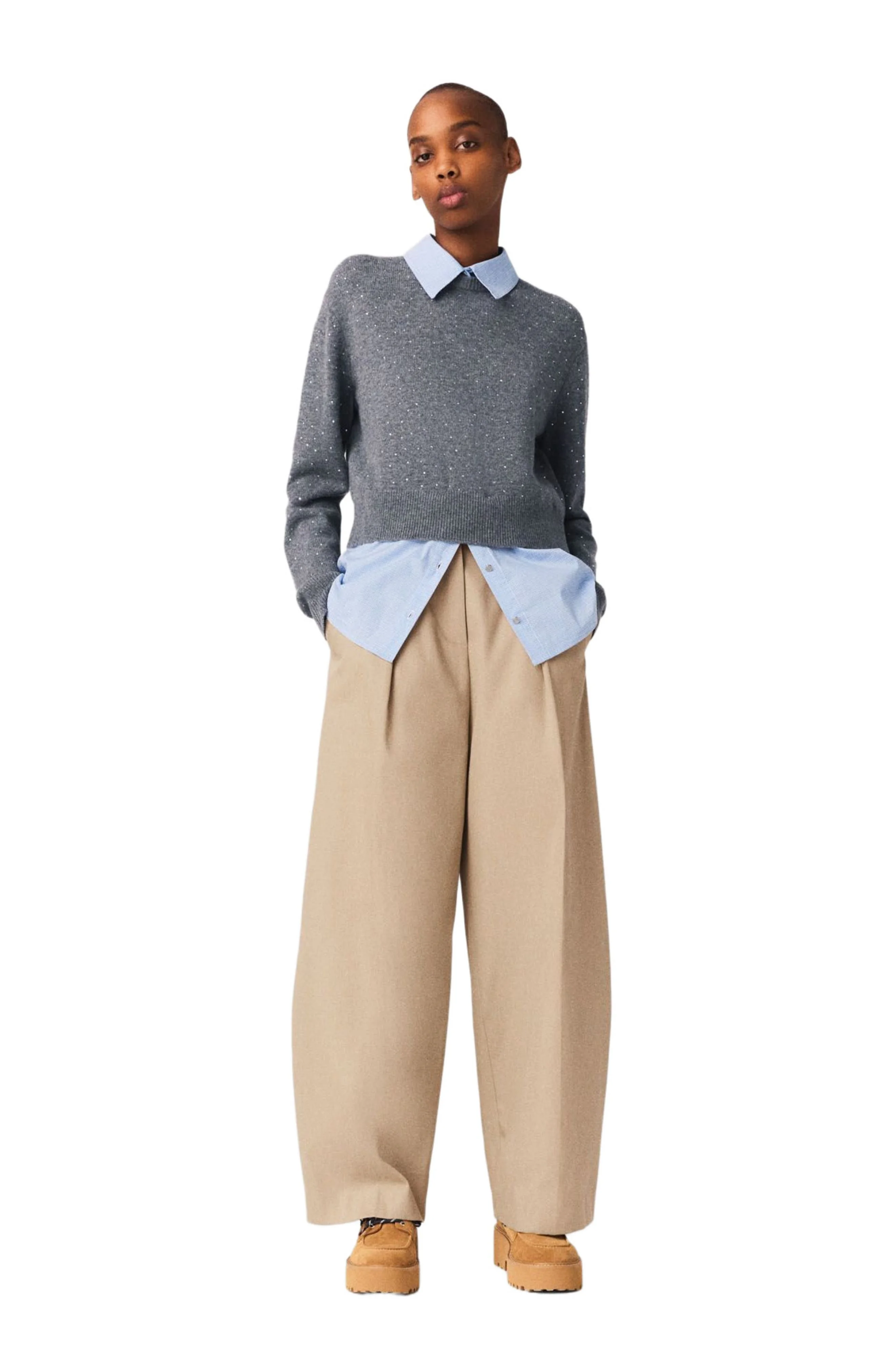 The Maje woman asserts her style with clean lines, gold details and a resolutely exploratory energy. These cotton trousers are captivating with their ultra-wide fit, structural box pleats and a light-catching gold button at the waist. Perfect for creating a graphic, modern look, they reinvent tailoring essentials with spontaneity.Pair them with a versatile sweater with shirt details and suede boat shoes to play with textures for a bold and casual look. Wide-leg cotton balloon trousers Pronounced box pleats on the front Round gold-tone metal button Very wide leg Slanted Italian pockets The model is 5'7 tall and wears a size 4