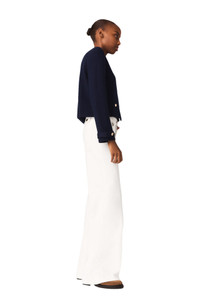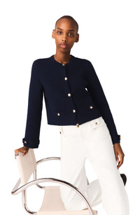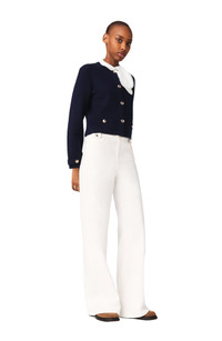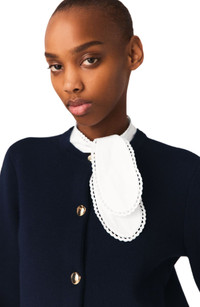 The Maje woman makes a style statement with this structured yet delicate piece that reinterprets chic nautical codes.This navy cropped cardigan, adorned with a removable embroidered cotton collar and dazzling gold-tone buttons, offers a sophisticated play on contrasts and lets you create different looks to suit your mood.Pair it with wide-leg white trousers and platform shoes for an elegant, contemporary silhouette. Cropped cardigan in a fine wool blend Removable scalloped embroidered cotton collar Round gold-tone buttons on the front and cuffs 2 patch pockets with decorative buttons Long sleeves with wide buttoned cuffs The model is 5'7 tall and wears a size 1
