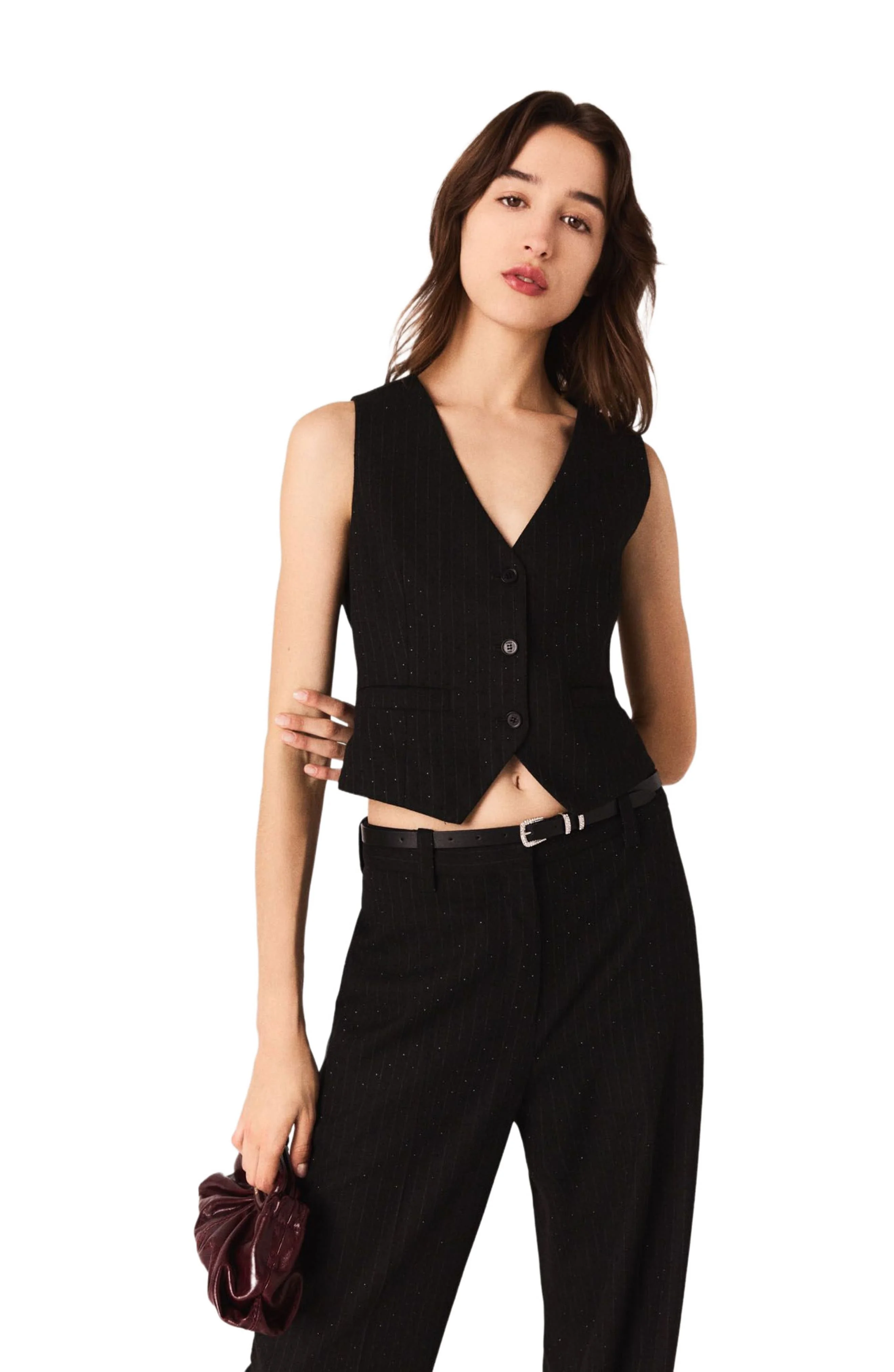 The night grows intense, silhouettes shimmer and command attention. Maje unveils pieces designed to shine after dark.A blend of sharp tailoring and subtle sparkle, this sleeveless jacket reinterprets the codes of suiting. The fine diamante pinstripes add a luxurious touch, while its tailored fit flatters the silhouette. A belt detail at the back and side pockets add a practical touch.Wear with the matching trousers, heels and a mini bag for a chic look. Sleeveless pinstripe jacket Diamante details V-neck Belt detail at the back The model is 5'8 tall and wears a size 36