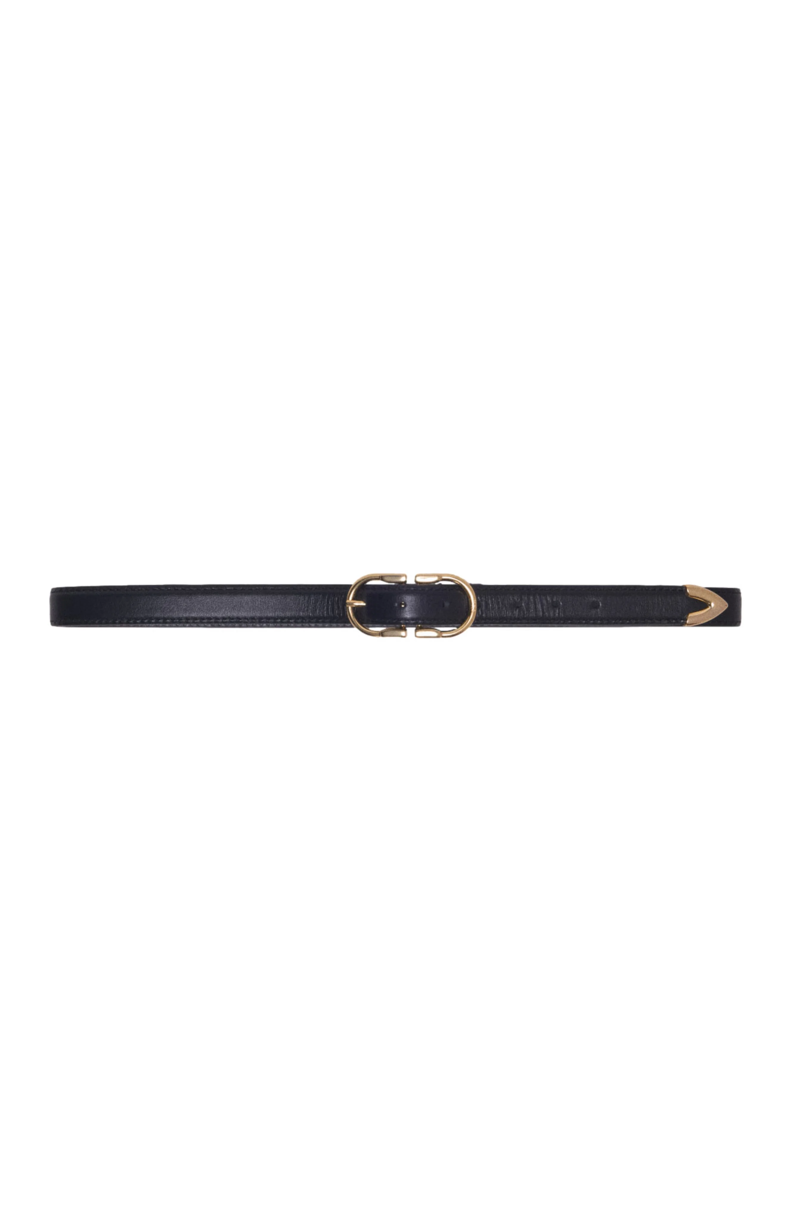 The new season's metropolitan style inspires sophisticated accessories that give every outfit a confident, contemporary look. This smooth camel leather style focuses on elegant details: a graphic gold buckle, a shiny V-shaped tip and refined topstitching to accentuate the waist with distinction. Wear it over the ecru knit dress and add an M Tote bag to structure and brighten up your silhouette. Slim leather belt Signature gold oval buckle Gold V-shaped metal tip Tone-on-tone topstitching Width: 2 cm The model is 5'8 tall and wears a size 1