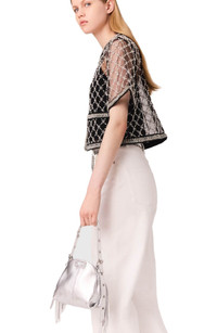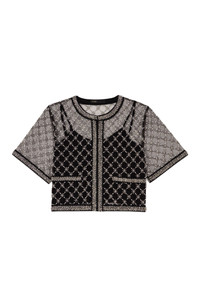 Made from dainty tulle, this crop top features a criss-cross pattern of glittering embroidered beads for a graphic effect. The trim and mock pockets balance the interplay of see-through detailing. Versatile and assertive, it can be worn on its own or as a cardigan, layered over the removable tank top .Look glamorous day or night with jeans, a belt and pumps for effortless chic. Short tulle top Embroidered beads Embroidered braid trim Hook-and-eye fastening Removable tank top with spaghetti straps The model is 5'9 tall and wears a size 1