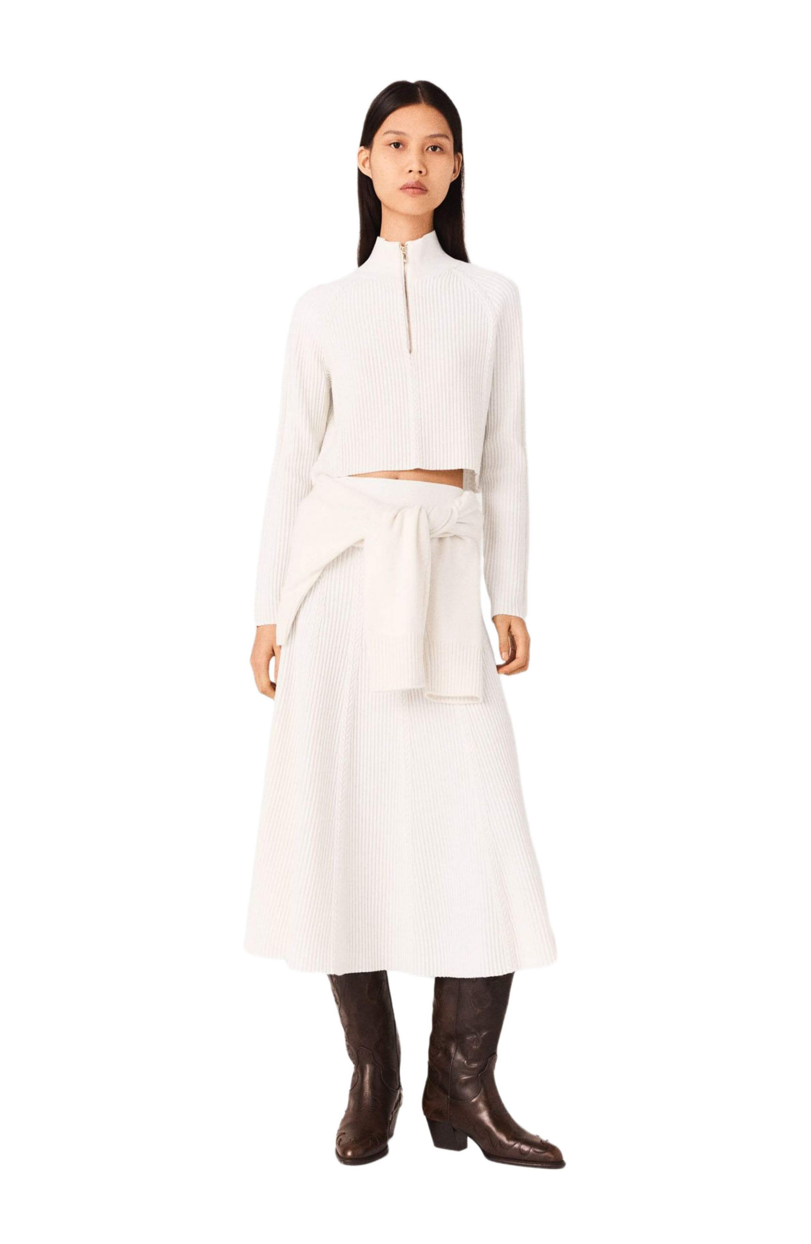 With assertive lines and liberated volumes, this season sets the tone for a free, confident silhouette.A new wardrobe essential, this cable-knit sweater creates a comfortable, structured silhouette. It has a zip-up high neck and a cropped fit, and can be worn with the matching knit skirt to complete the look. Accentuate it with iconic accessories like cowboy-style boots. Cropped cable-knit jumper Zip-up high neck Ribbed trim at the waist and cuffs The model is 5'8 tall and wears a size 1