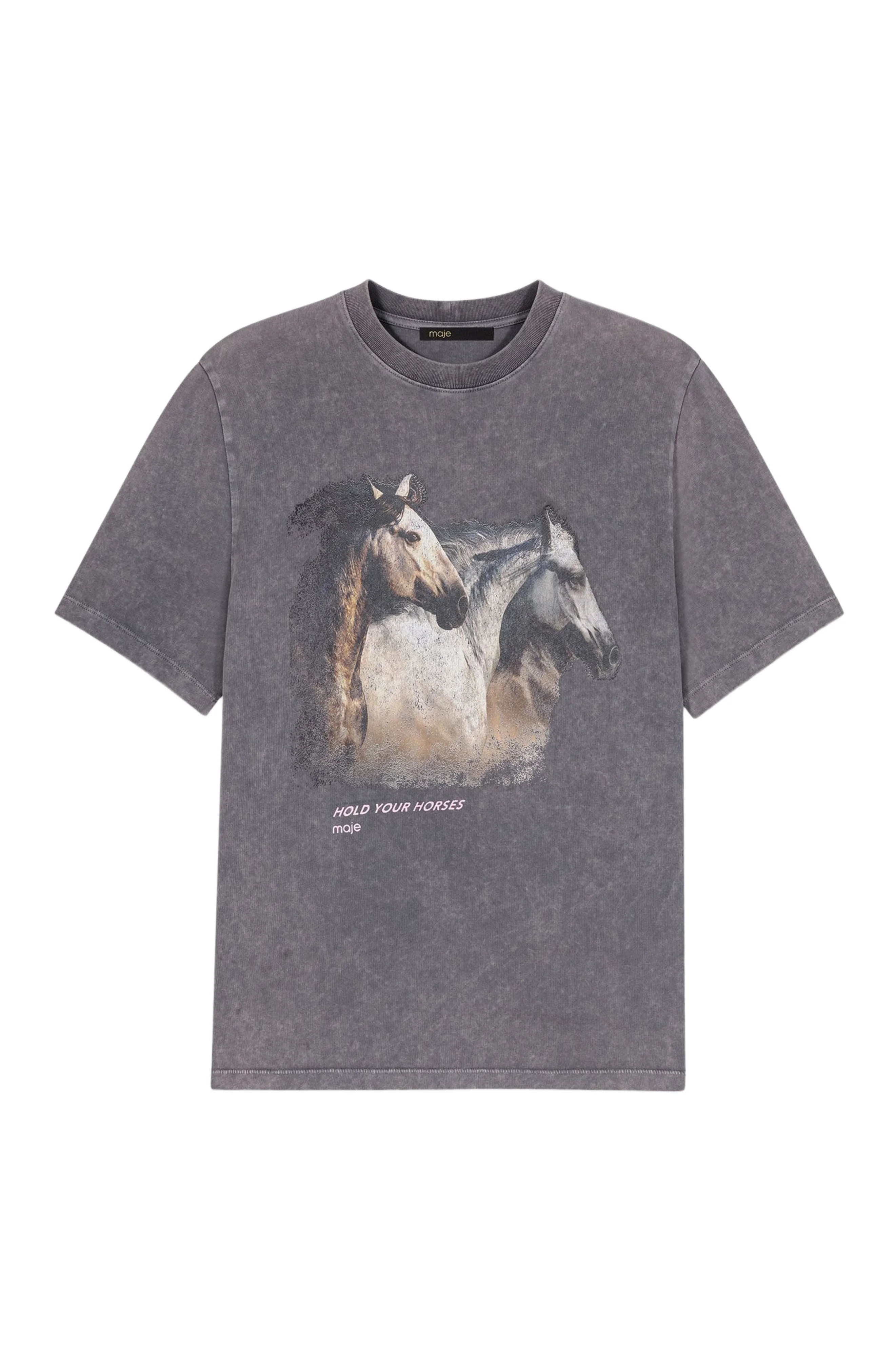 This year, the spirit of the Chinese New Year capsule, which puts the horse in the spotlight, is tinged with boldness and freedom. Maje has designed a wardrobe where visual art is incorporated into reinvented basics.This cotton T-shirt, with its boxy fit and effortless appeal, is captivating with its faded effect and horse print, signed with a message in soft pink.For a modern, graphic silhouette, mix it with a textured mini skirt and silver pumps, and add slim sunglasses and white socks for a contemporary touch. Horse-print T-shirt Marbled stone-washed effect 100% Cotton Slightly loose boxy fit The model is 5'8 tall and wears a size 1