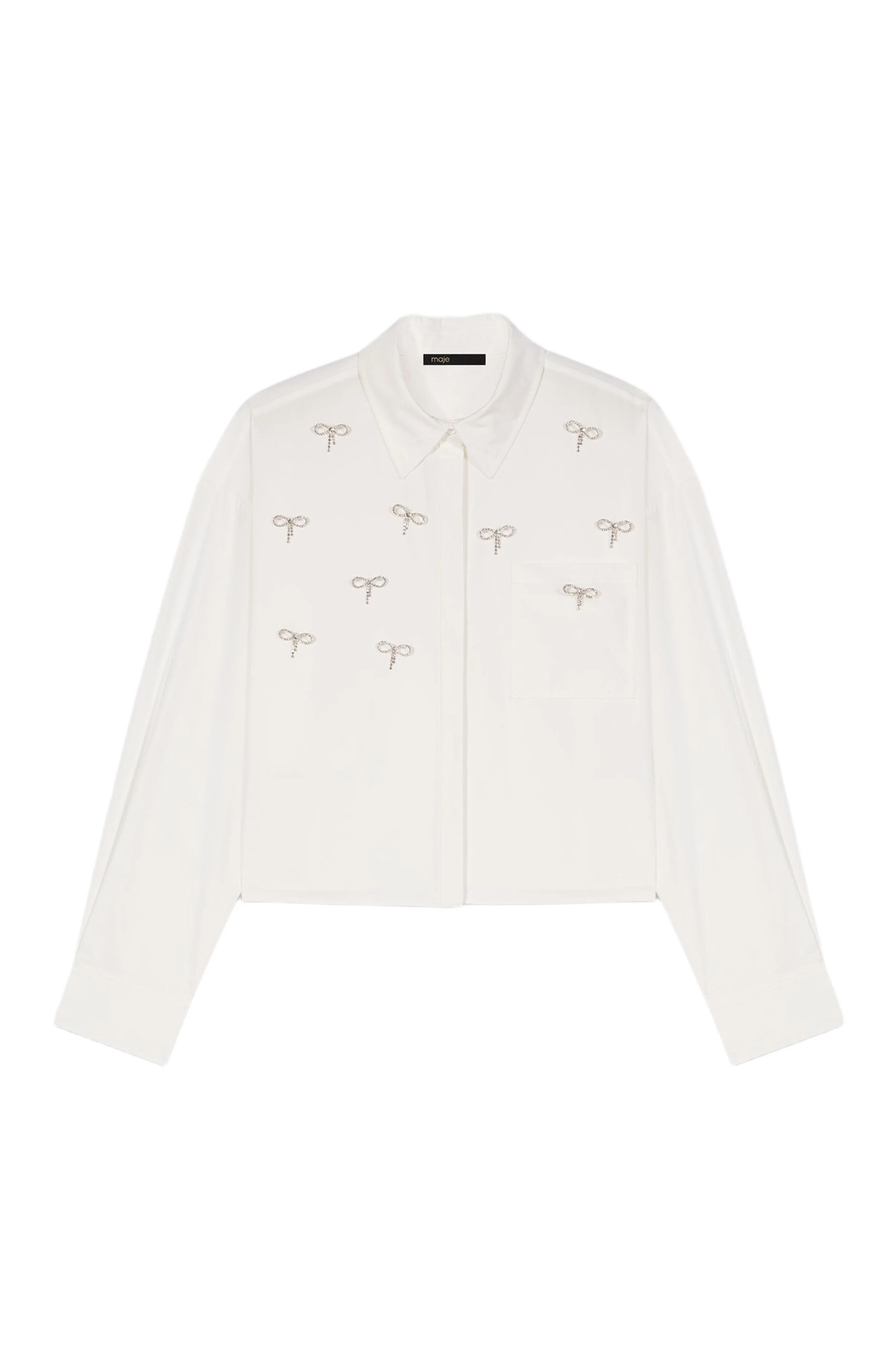 For a bright, modern wardrobe, the studio reinvents the white shirt with modern silhouettes and bold details.This cropped cotton poplin shirt, embellished with embroidered bows in sparkling rhinestones, plays with the light and adds a touch of sparkle to your everyday look; its boxy cut offers a modern feel and ease of movement.Pair it with wide-leg jeans, a mini Miss M bag and loafers for a confident city look. Loose, cropped cotton shirt Embroidered bow motifs and silver rhinestones Concealed button placket Patch chest pocket Box pleat at the back The model is 5'8 tall and wears a size 1
