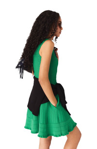 A signature piece for an assertive, modern wardrobe, this green knit dress plays on technical contrasts and a free-spirited femininity.Its rib knit reveals a fitted top, a well-defined waist and a skater skirt with a pleated effect, accentuated by a ruffled hem for movement.For a modern look, layer a black top underneath and accessorise the outfit with camel loafers and a navy Miss M bag. Knit skater dress Contrasting, structured rib knit Short, flared skater cut Square neckline at the front and back Wide straps Ruffled hem Two integrated side pockets The model is 5'9 tall and wears a size 4