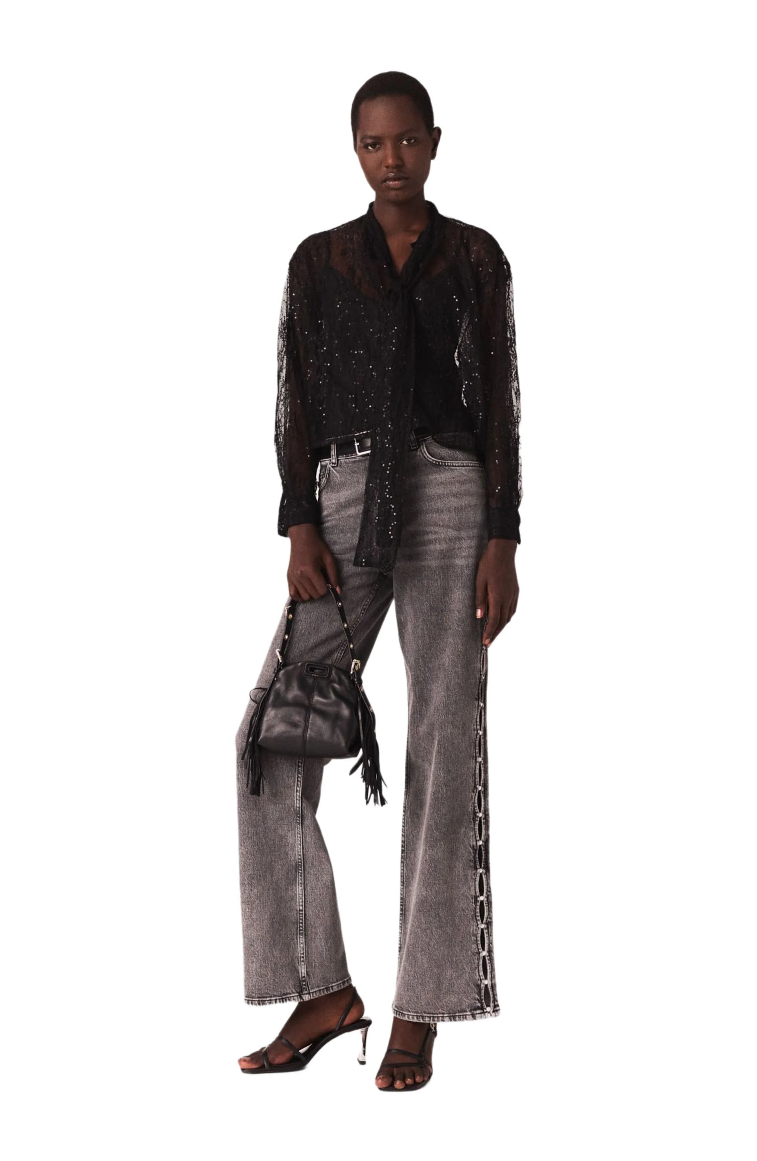 This new season, Maje is reinventing the wardrobe with characterful pieces in unexpected materials. Discover a piece of bold elegance, designed to shine throughout the seasons. This lightweight shirt plays on the contrast between the sheerness of the lace and the discreet sparkle of the sequins. Wear it alone or layered, to add a twist to your denim or make an evening outfit shine, and finish the look with signature accessories: a fringed bag, a leather belt and mirror-heeled sandals. Sheer sequinned lace pussy-bow shirt Removable camisole Long sleeves and a tie-neck pussy-bow collar The model is 5'8 tall and wears a size 1