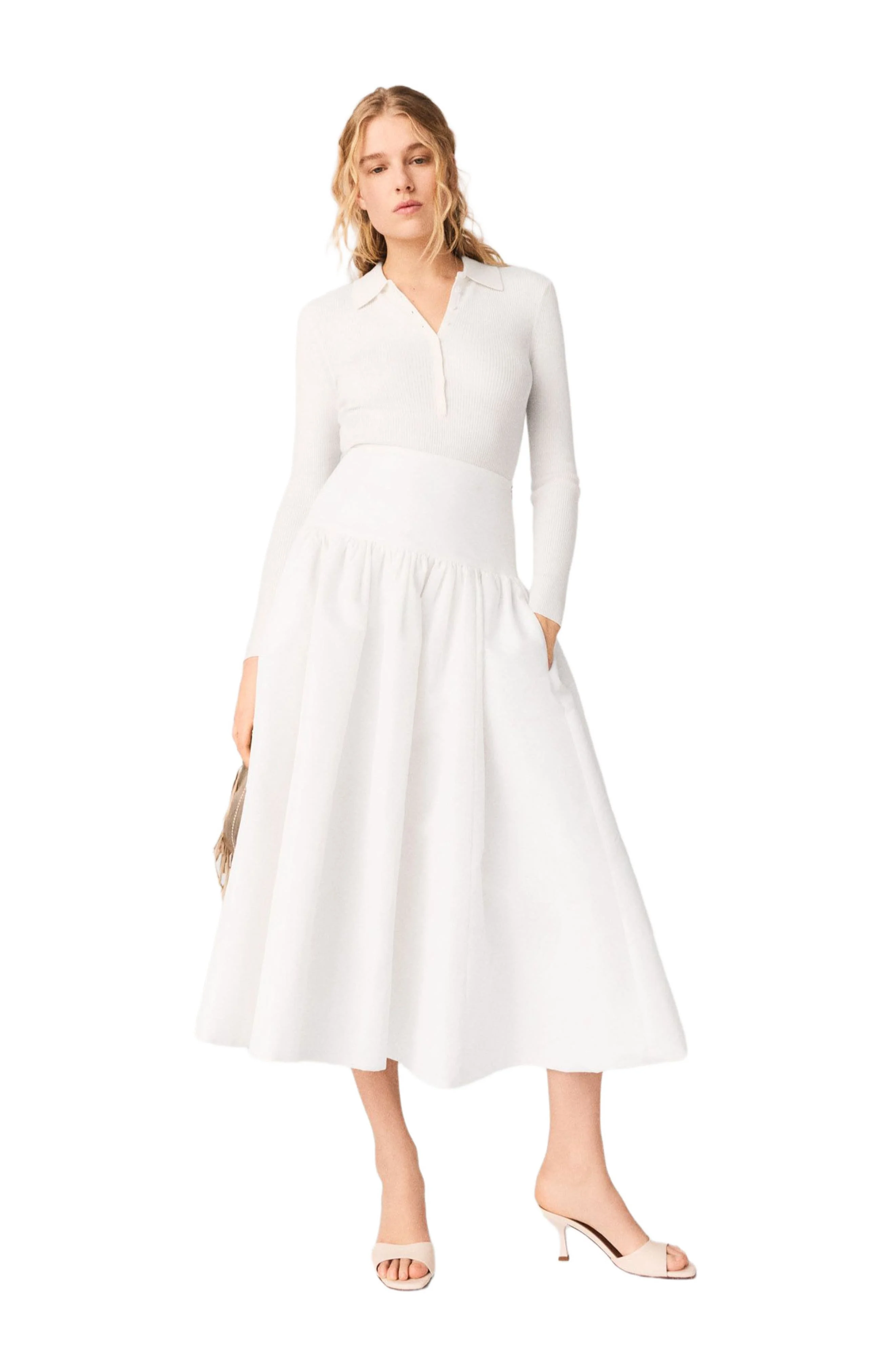 White takes on a new dimension: clean lines, ample volumes and discreet modernity, an ode to the assertive femininity of the Maje woman.This midi skirt creates a graphic silhouette thanks to its high waist, structured by a smooth waistband that contrasts with the generous gathers below. Its flared and voluminous cut is enhanced by practical side pockets, while the matte finish highlights its minimalist and refined look.For a luminous look, pair it with a fitted knit polo shirt, heeled mules and a gold fringed bag. Structured high-waisted flared midi skirt Wide, flat waistband and voluminous gathers In-seam side pockets Discreet side zip fastening Simple hem and matte finish The model is 5'8 tall and wears a size 36