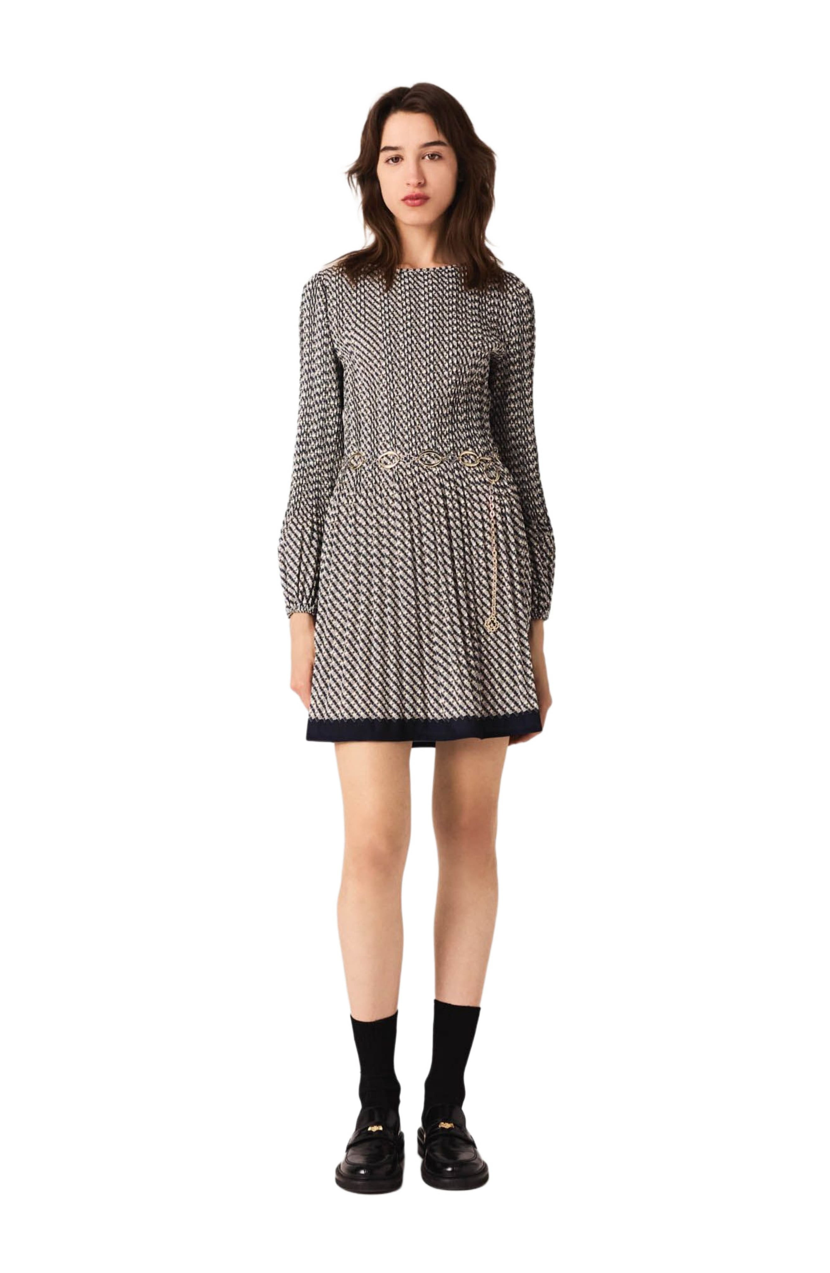 The collection invites a light and graphic femininity, driven by plays on volume and signature prints.Fully pleated, this chiffon dress with a bow print features a smocked top and wide sleeves that add rhythm to the silhouette. With a round neck adorned with a contrasting trim at the bottom, it is easily accessorised with the collection's key pieces: a jewellery belt and leather loafers. Printed chiffon pleated dress Round neck and voluminous long sleeves Smocked effect on top and contrasting trim at the bottom The model is 5'9 tall and wears a size 4