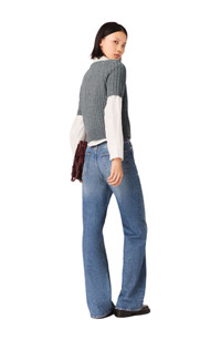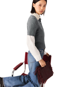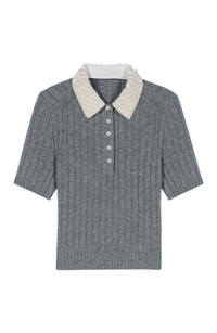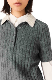 The modern wardrobe is reinvented with exquisite pieces, blending confident sophistication with a playful spirit.This grey knit polo shirt, crafted from ribbed wool, flatters the silhouette with its cropped cut and removable beaded collar, for a look that is by turns minimalist and couture. The silver-toned buttons and raglan design add a contemporary touch.To play up the contrast, team it with wide-leg high-waisted jeans, a black leather belt, a burgundy Miss M bag and loafers, or wear it layered over a white shirt for a graphic, modern feel. Ribbed wool knit Removable shirt collar embroidered with beads Cropped, fitted cut Short raglan sleeves The model is 5'8 tall and wears a size 1