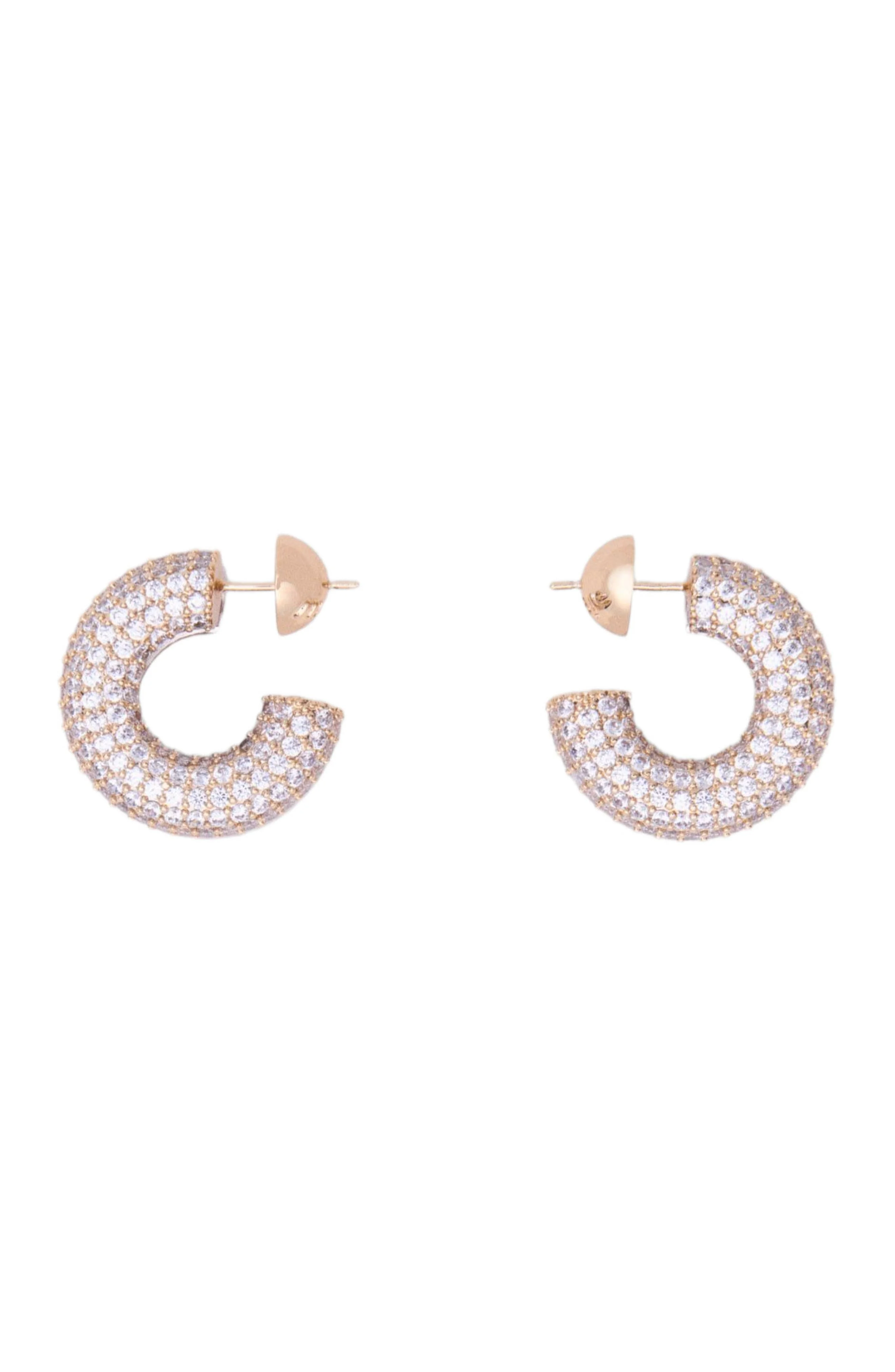 An interplay of contrast and sparkle for this creation inspired by the Maje wardrobe, combining sophistication and character.These half-hoops feature a double ring: one fine gold-plated and fully paved with rhinestones, the other smooth, polished silver-tone, set apart by a refined openwork inner structure. Pair with a black rib knit top to highlight their contemporary, graphic appeal. Rhinestone half-hoop style earrings Two-tone design: fine gold-plated, set with rhinestones, and silver-tone Openwork inner structure Clasp engraved with maje with a clover charm The model is 5'8 tall and wears a size one size