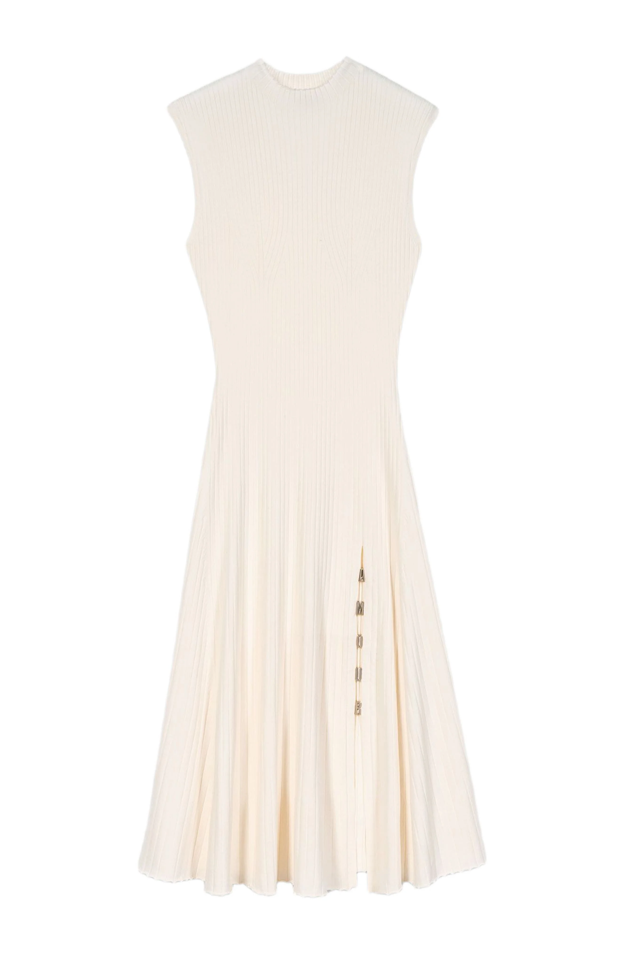 A return to modern elegance: this dress revisits the preppy wardrobe with a signature touch.Its rib knit accentuates the bust and the flared pleated skirt moves with you, while the side slit, punctuated by gold AMOUR lettering, asserts a playful, modern femininity.For a sophisticated city look, create a contrast with a slim chain and leather belt, platform loafers and a large, hand-carried, dual-material tote bag. Fitted rib knit Flared pleated skirt High round neck Sleeveless Slit adorned with gold AMOUR lettering Midi length The model is 5'8 tall and wears a size 4