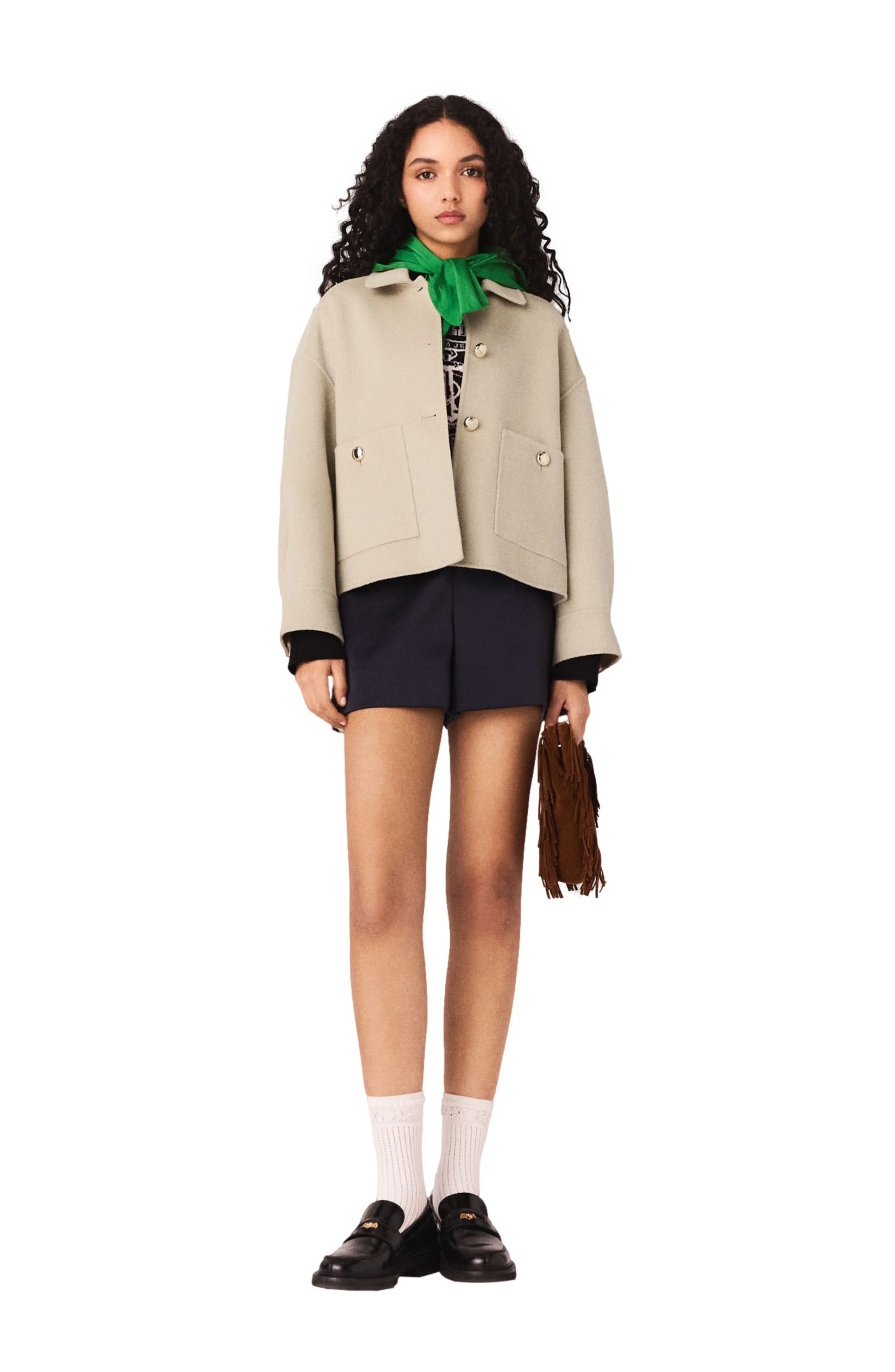 The new Maje wardrobe is inspired by the quiet strength of modern women, blending metropolitan sophistication with bold technical details.This short beige wool-blend jacket has a straight, loose fit at the front, while the back is subtly flared thanks to refined pleating. Its patch pockets and wide sleeves with buttoned tabs create a structured and bold look. For a graphic, contemporary silhouette, pair it with navy shorts, a green waterproof hood, black loafers and a burgundy M bag. Short wool-blend jacket with a pleated back Straight fit with an A-line back Large patch pockets with flaps Large gold dome buttons Buttoned cuff tabs Designed for a boxy fit The model is 5'9 tall and wears a size 4