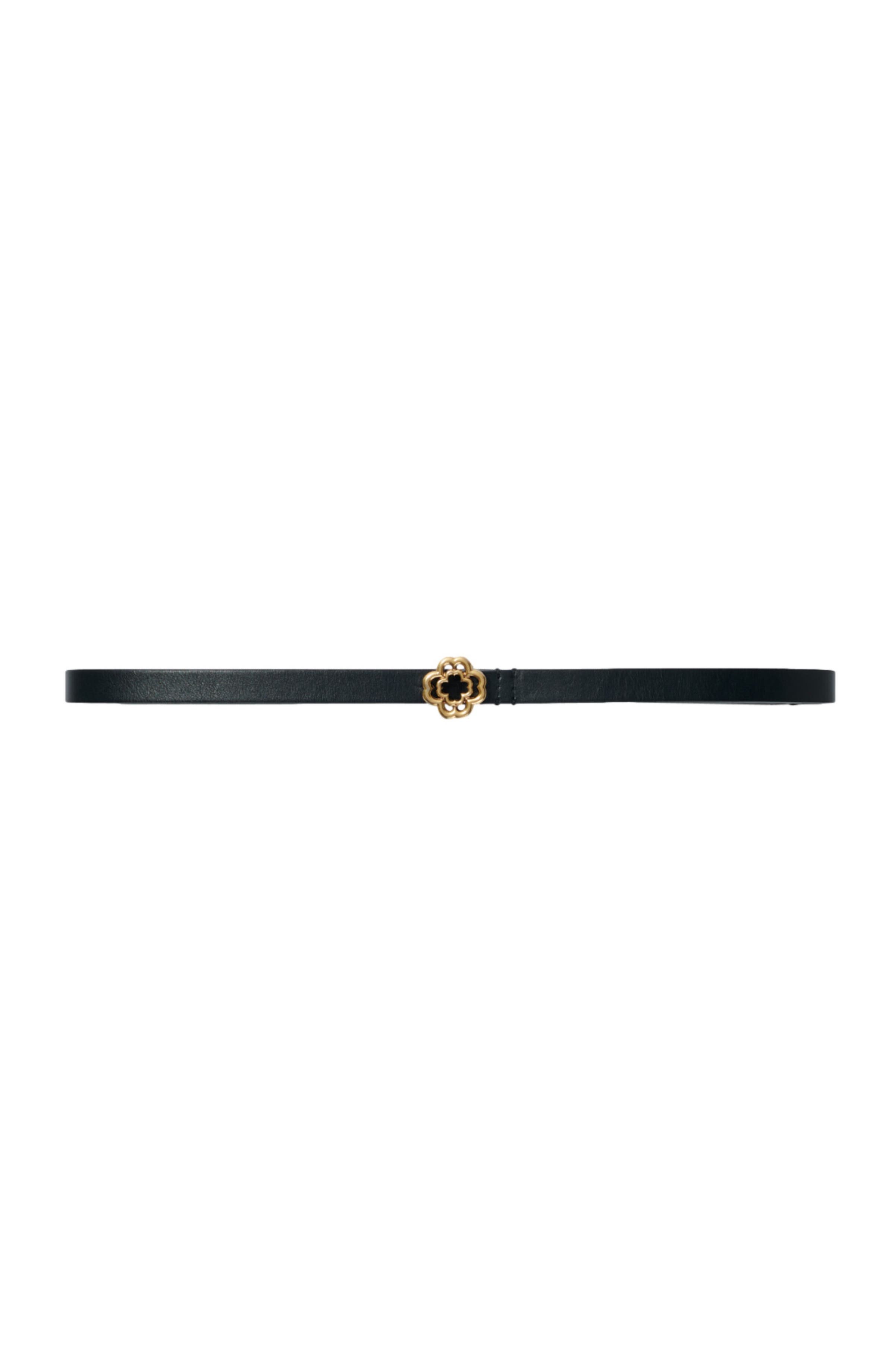 As the seasons change, Maje creates accessories imbued with elegance and sophistication for a stylish way to set off your look. Add a gold Clover buckle to your look with this plain leather belt. This slim, adjustable belt emphasises your waist in style and can be worn on any occasion. Slip it through the belt loops of your jeans or wear over a floaty dress for a chic, structured silhouette. Plain leather slim belt Gold Clover buckle Length: 77.50 cm Width: 1.50 c The model is 5'8 tall and wears a size 1