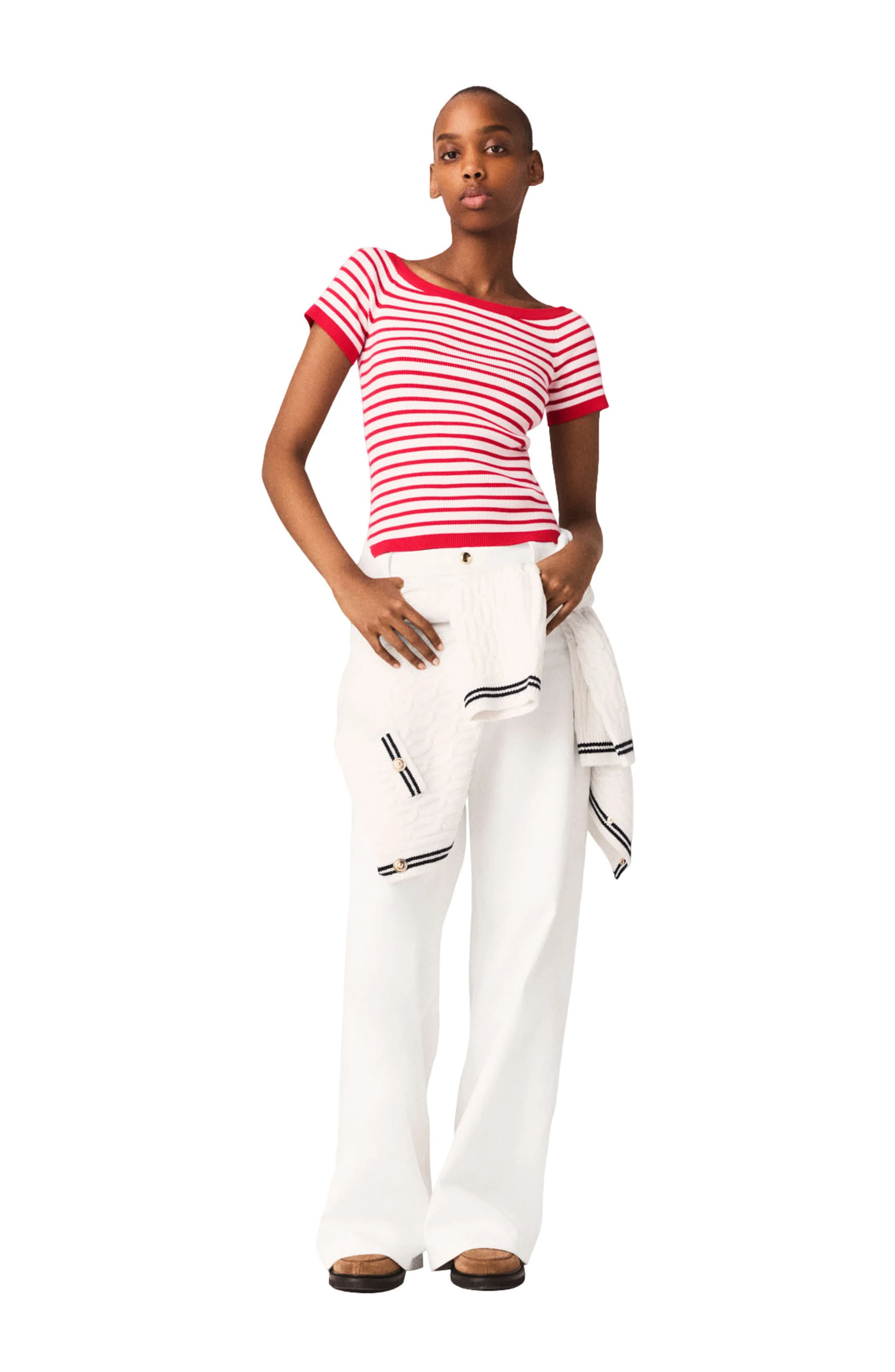 The Maje woman asserts her style with graphic, modern pieces inspired by the energy of a reinvented nautical wardrobe.This rib knit top has a figure-hugging silhouette, highlighting the boat neckline and the red and white stripes. The red ribbed trim and the heart charm on the back add a delicate touch to the piece.Pair it with wide-leg white trousers, a quilted cardigan tied at the waist and leather loafers for a modern, structured look. Striped rib knit top Wide boat neckline Cropped, fitted style Signature Maje logo charm on the back Red ribbed trim The model is 5'7 tall and wears a size 1