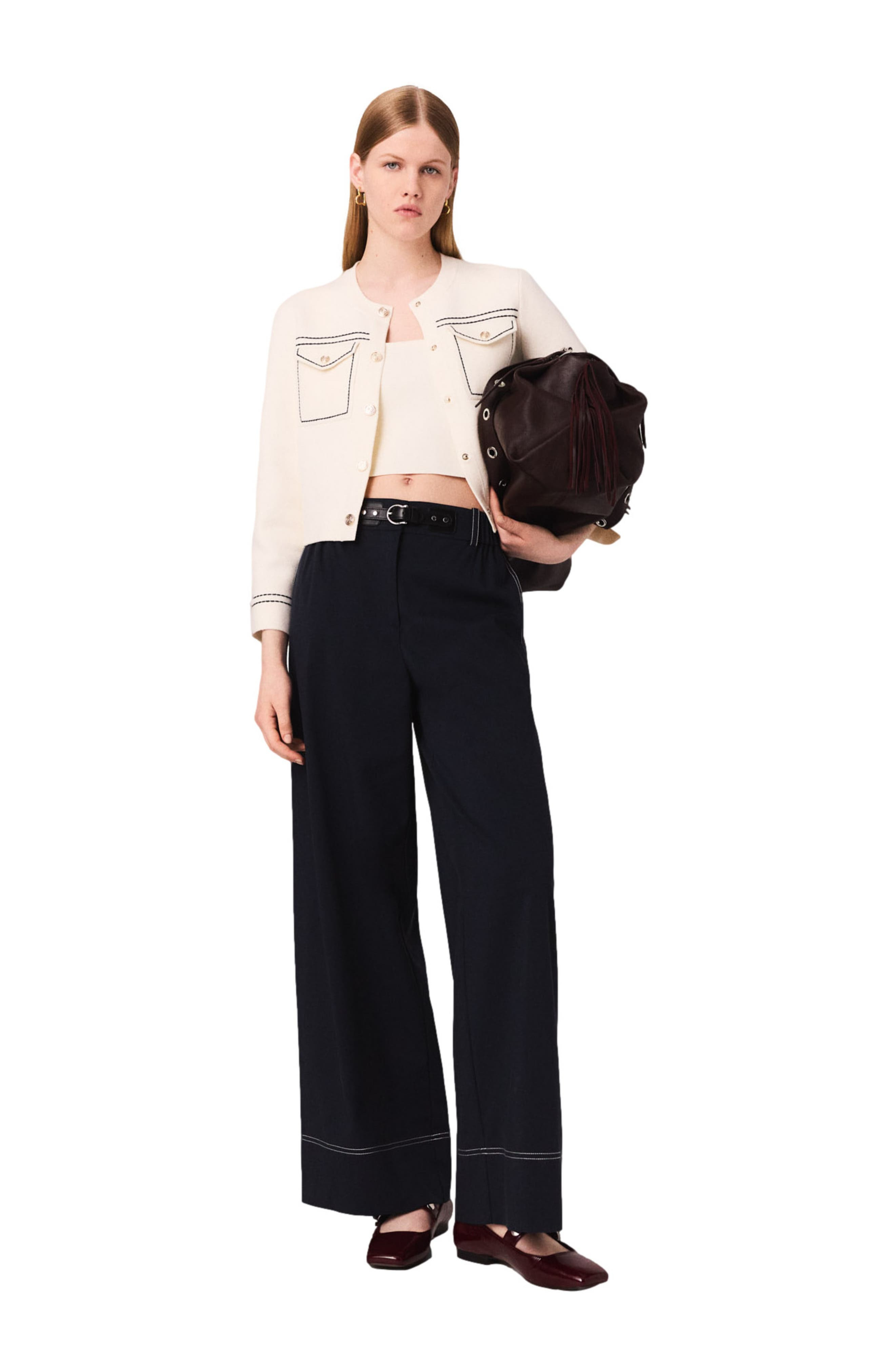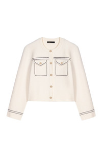 Maje offers a metropolitan collection, combining modernity and a preppy spirit for a smooth transition through the seasons.This short knit cardigan, adorned with contrasting topstitching, adds a touch of sophistication to your look. Featuring a round neck and long sleeves, it reveals patch pockets with flaps and a button fastening. Ideal for mid-season, wear it with a casual T-shirt and faded jeans, enhanced with signature accessories. Short knit jacket with contrasting topstitching Round neck and long sleeves 2 patch pockets with flaps on the chest Decorative press-stud fastening The model is 5'9 tall and wears a size 1