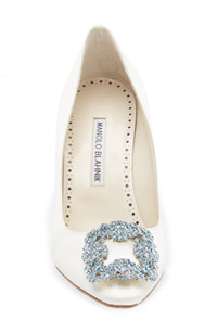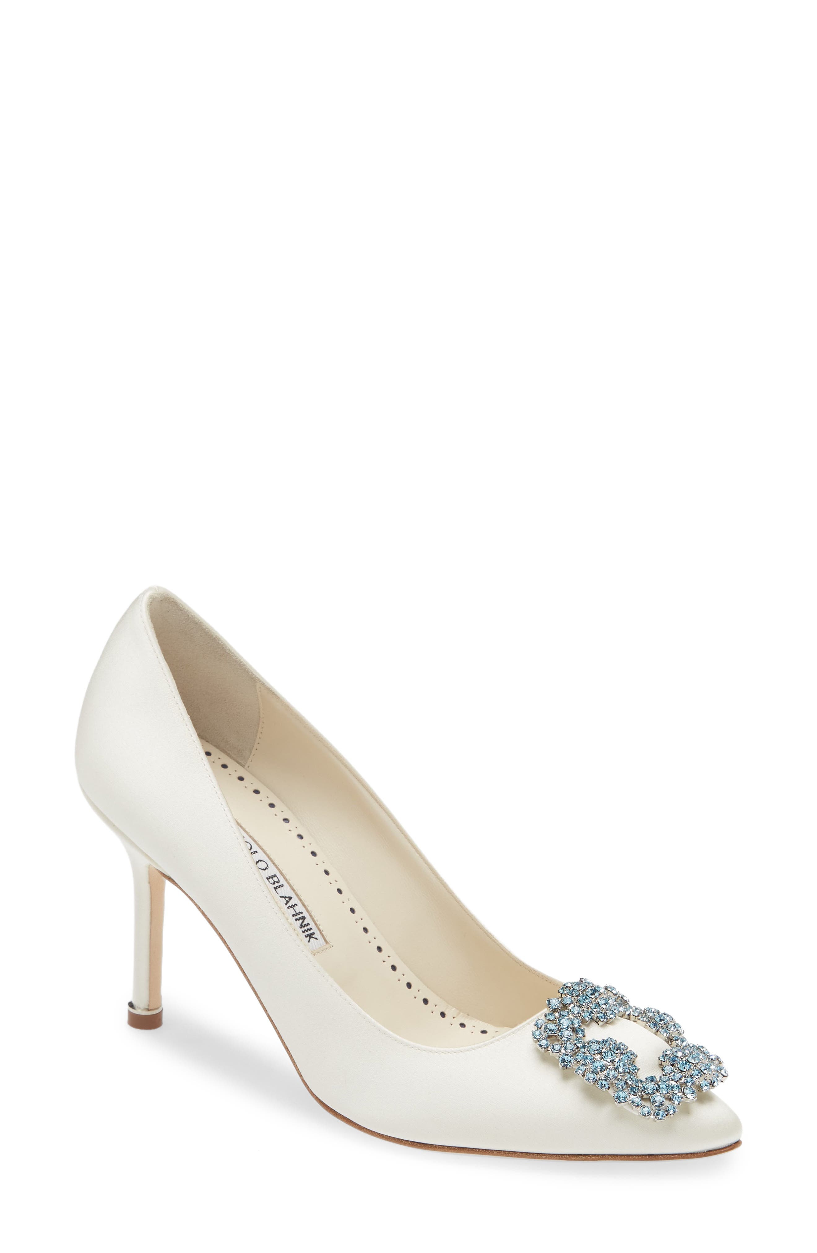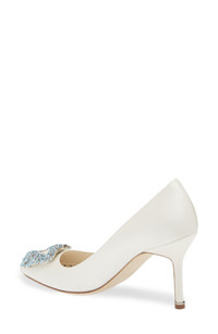 Say 'I do' to the timeless beauty of this satin pump featuring the Hangisi's signature crystal brooch at the almond toe updated in a something-blue hue. 3 1/4" (83mm) heel Textile upper/leather lining and sole Made in Italy Designer Shoes
