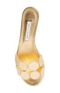 Manolo draws inspiration from the fluid shapes and innovative vision of sculptor Alexander Calder and artist Henri Matisse with this metallic-leather slide topped with a geometric toe strap. 1" (25mm) heel (size 8.5) Leather upper, lining and sole Made in Italy Designer Shoes