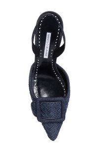 This denim slingback pump topped with an oversized buckle has earned cult-favorite status since its '91 debut, when Manolo introduced the style for Isaac Mizrahi's catwalk collection. 2 3/4" (70mm) heel Elasticized slingback strap Textile upper/leather lining and sole Made in Italy Designer Shoes